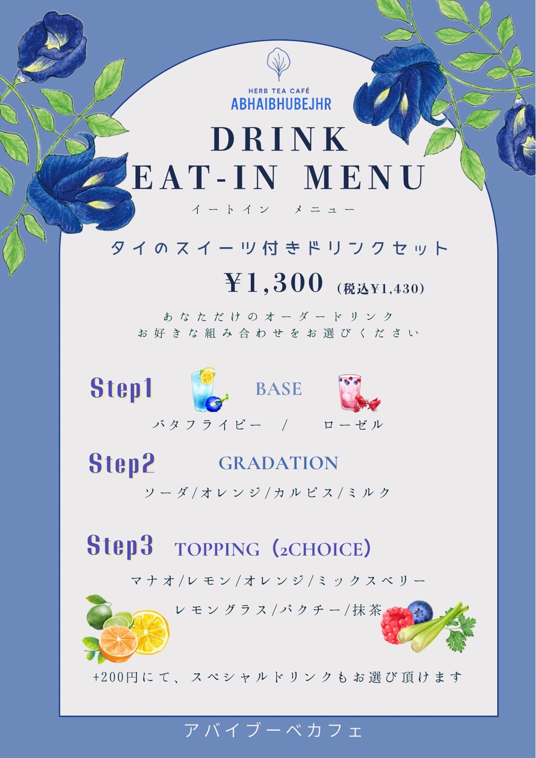 アバイブーベカフェオープンを記念して、2025年5月31日までの期間、テイクアウトに限り、バタフライピーソーダ、ローゼルソーダの2種類がワンコイン(@500円)でお楽しみいただけます。バタフライピーはカラーチェンジをお楽しみいただけるようレモンのカットもついております。この機会にぜひタイハーブティーの美味しさはもちろん美しさもご体感ください。