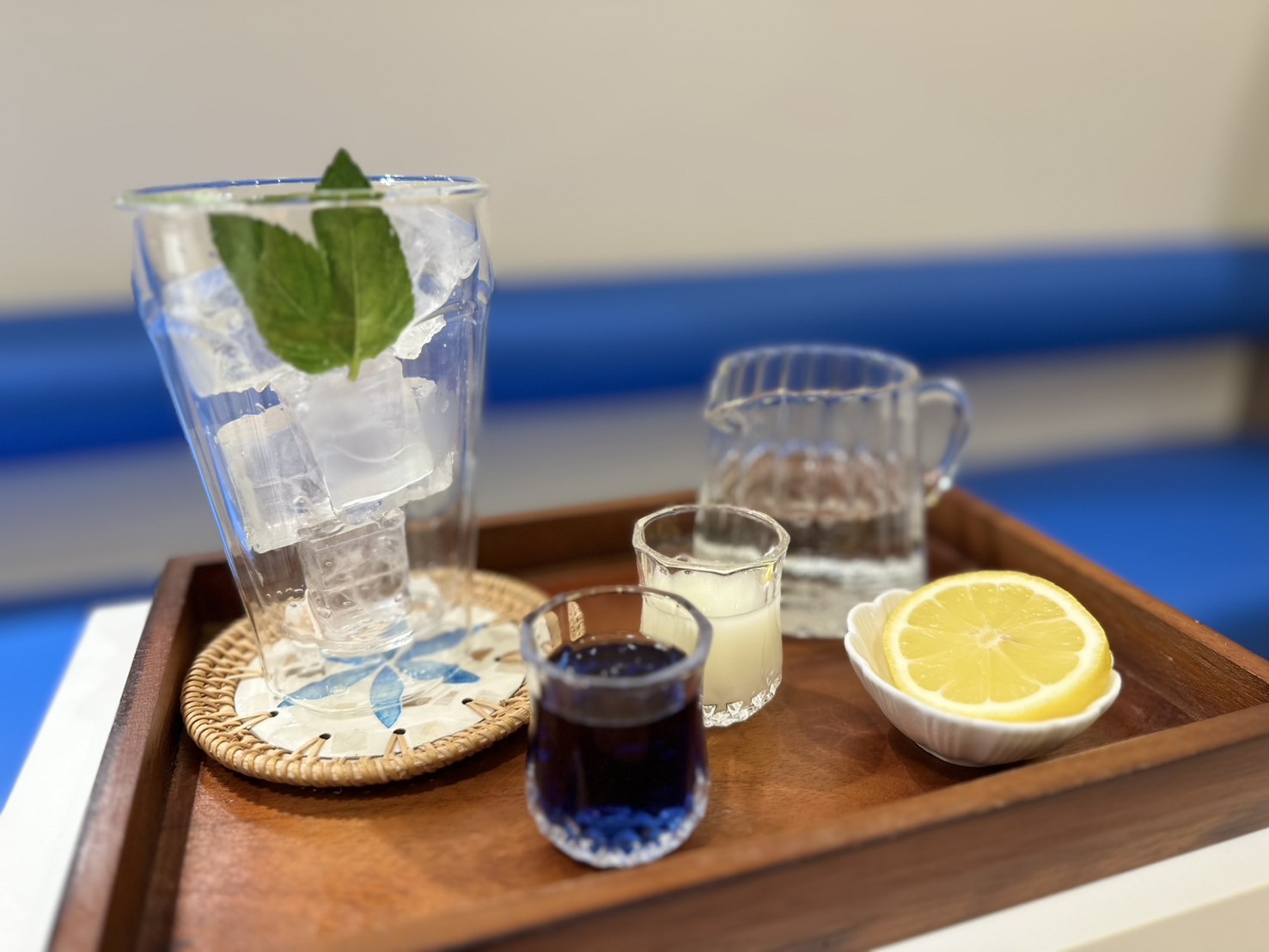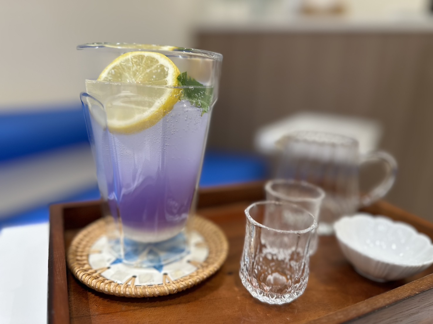 イートインメニューのバタフライピーxカルピス(レモンスライス付)