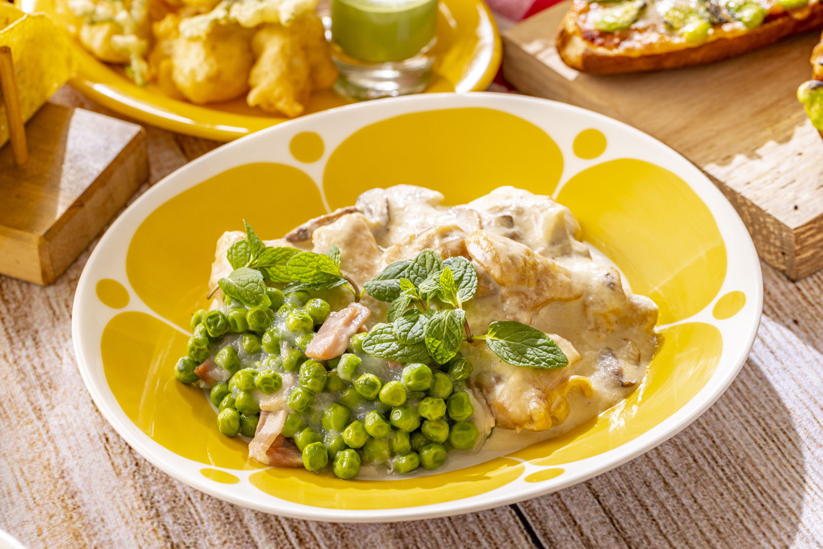チキンのクリーム煮にミントの爽やかな風味をプラスし、軽やかな口当たりでお召し上がりいただけます。