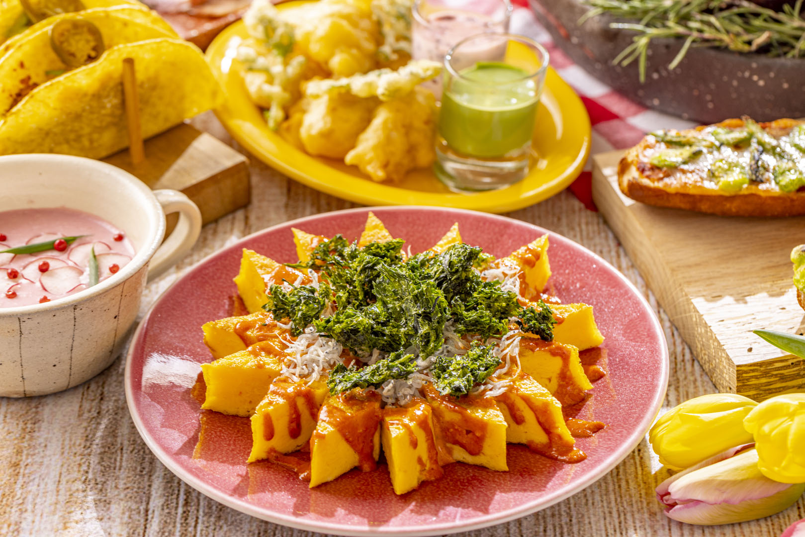 そして、蓬生や大葉などの和の香草とフレンチ料理のマリアージュをお楽しみいただける「クリスピービアバタードフィッシュ 桜と蓬生の2種のディップを添えて」、「プラントベースミートと春野菜、アスパラガスのラクトベジタリアンタルティーヌ 大葉ソース」をはじめ、桜の花塩漬けを使い鮮やかな桜色に仕立てた「桜風味のポタージュパルマンティエ」、あおさを仕上げに散らして磯の風味を加えた「スパニッシュオムレツ シラスと海苔飾り パプリカ風味」など、和を感じさせる香りの食材も取り入れ、春らしい一品も並びます。