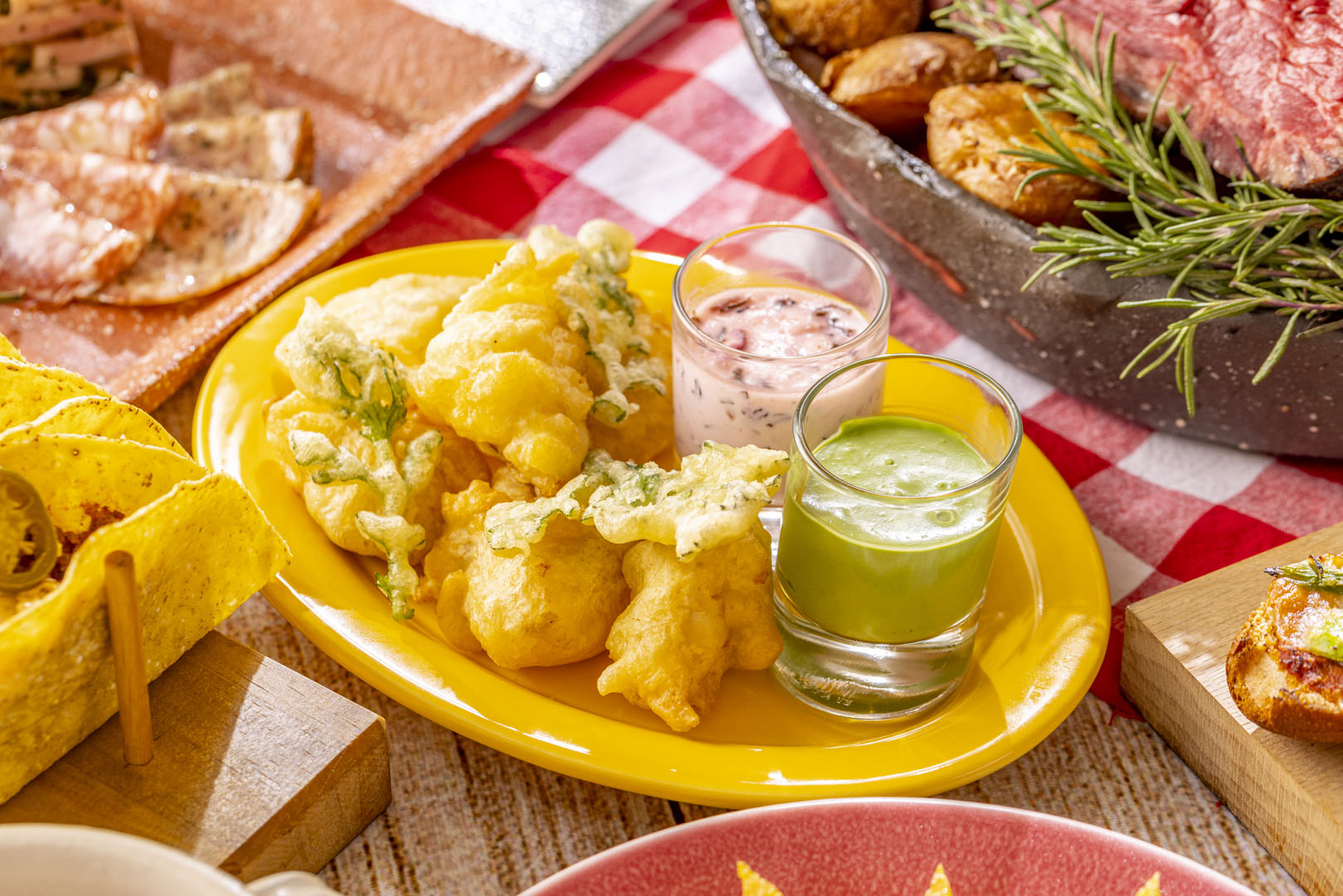 クリスピービアバタードフィッシュ 桜と蓬生の2種のディップを添えて