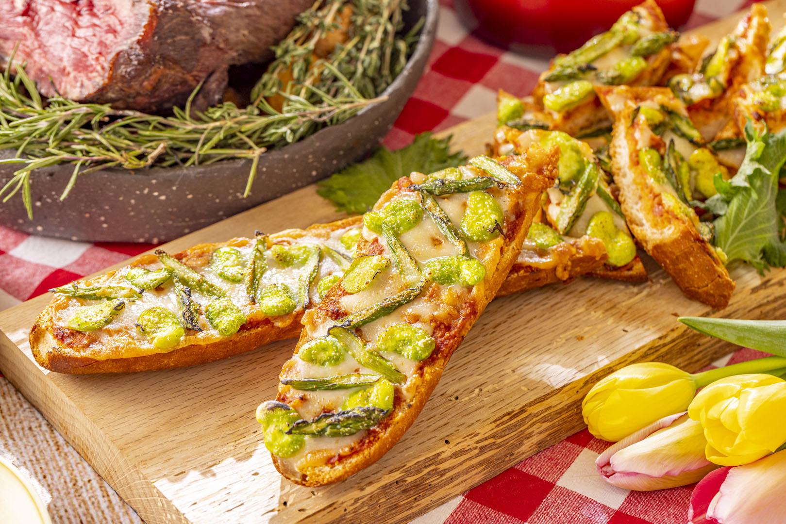 プラントベースミートと春野菜、アスパラガスのラクトベジタリアンタルティーヌ 大葉ソース