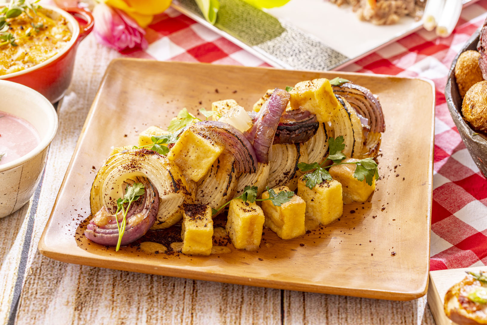 新玉ねぎのローストと豆腐のフリット タヒニソース スマック風味