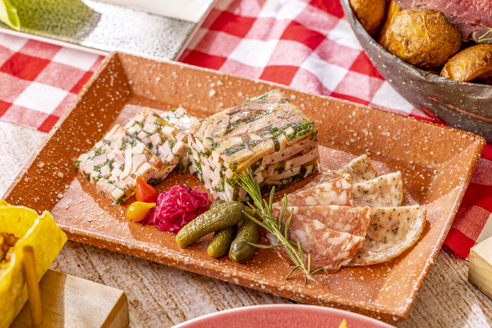 やわらかいハムをパセリなどの香草とともにコンソメゼリーに閉じ込めました。それぞれの旨みが折り重なり、豊かな味わいに。
