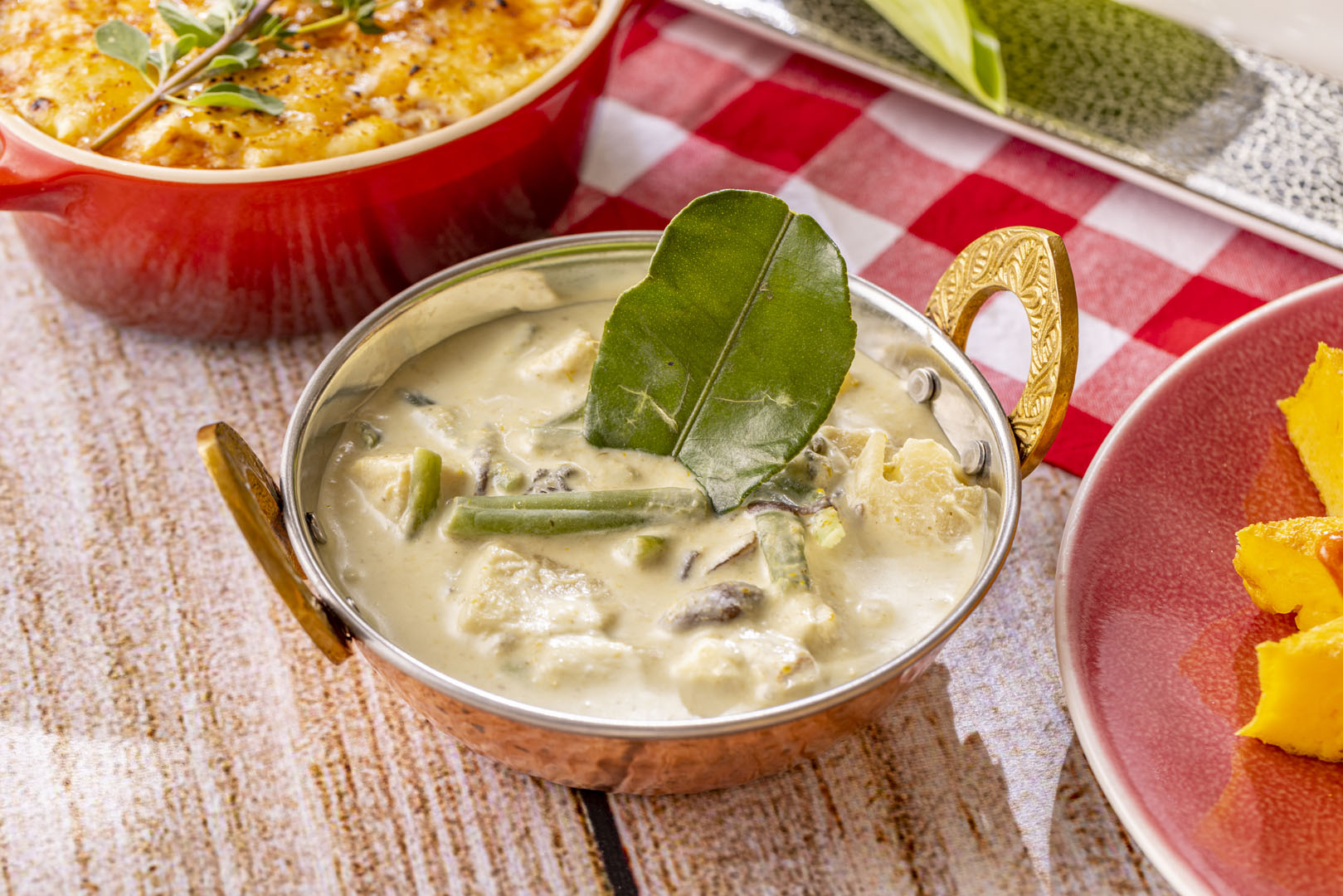 グリーンカレーの辛さの中に、バイマックルや山菜の爽やかな香りが広がります。コリアンダーライスとご一緒に。