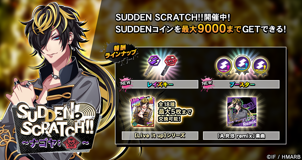 イベント期間中、KILLER SCRATCH!!をプレイするとライズ消費量に応じた確率でSUDDEN SCRATCH!!が発生します。SUDDEN SCRATCH!!をプレイすると、通常の報酬アイテムの他、限定アイテム「SUDDENコイン」を獲得することができます。「SUDDENコイン」を集めることで、レイズキーやナゴヤ・ディビジョンのデコステッカーに使えるブースターなどと交換することが可能です。他にも、ストーリーカードの【Live it up】シリーズ、「A.R.B remix」楽曲などがラインナップされています。詳細はアプリ内お知らせをご確認ください。