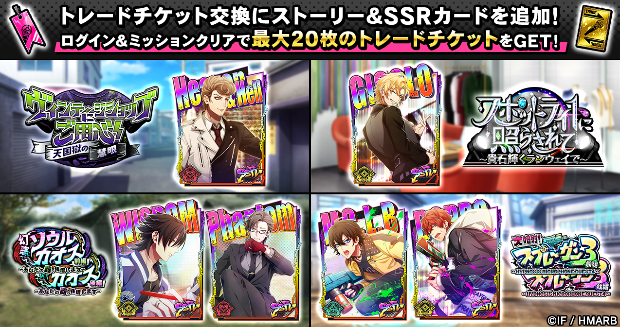 過去に開催されたストーリーイベントの報酬に登場したSSRカードがトレードチケット交換に追加されました。ログインやミッションクリアで、最大20枚のトレードチケットを獲得できるキャンペーンを実施しています。詳細はアプリ内お知らせをご確認ください。