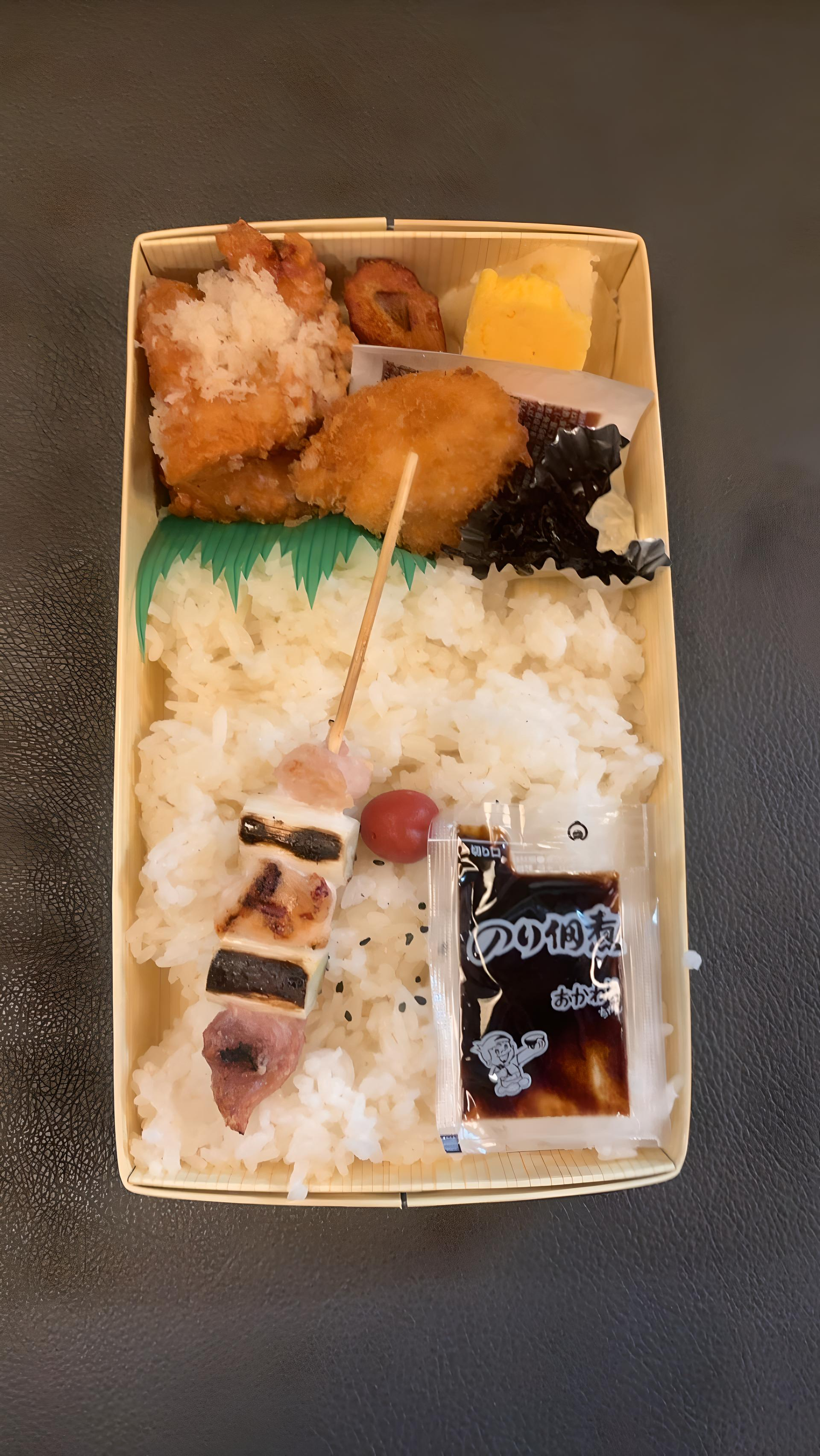 社長自慢の唐揚げ、炭火焼きの串焼きが入ったお弁当です。自慢の白米にお好みで海苔佃煮をかけてお召し上がりいただけます。