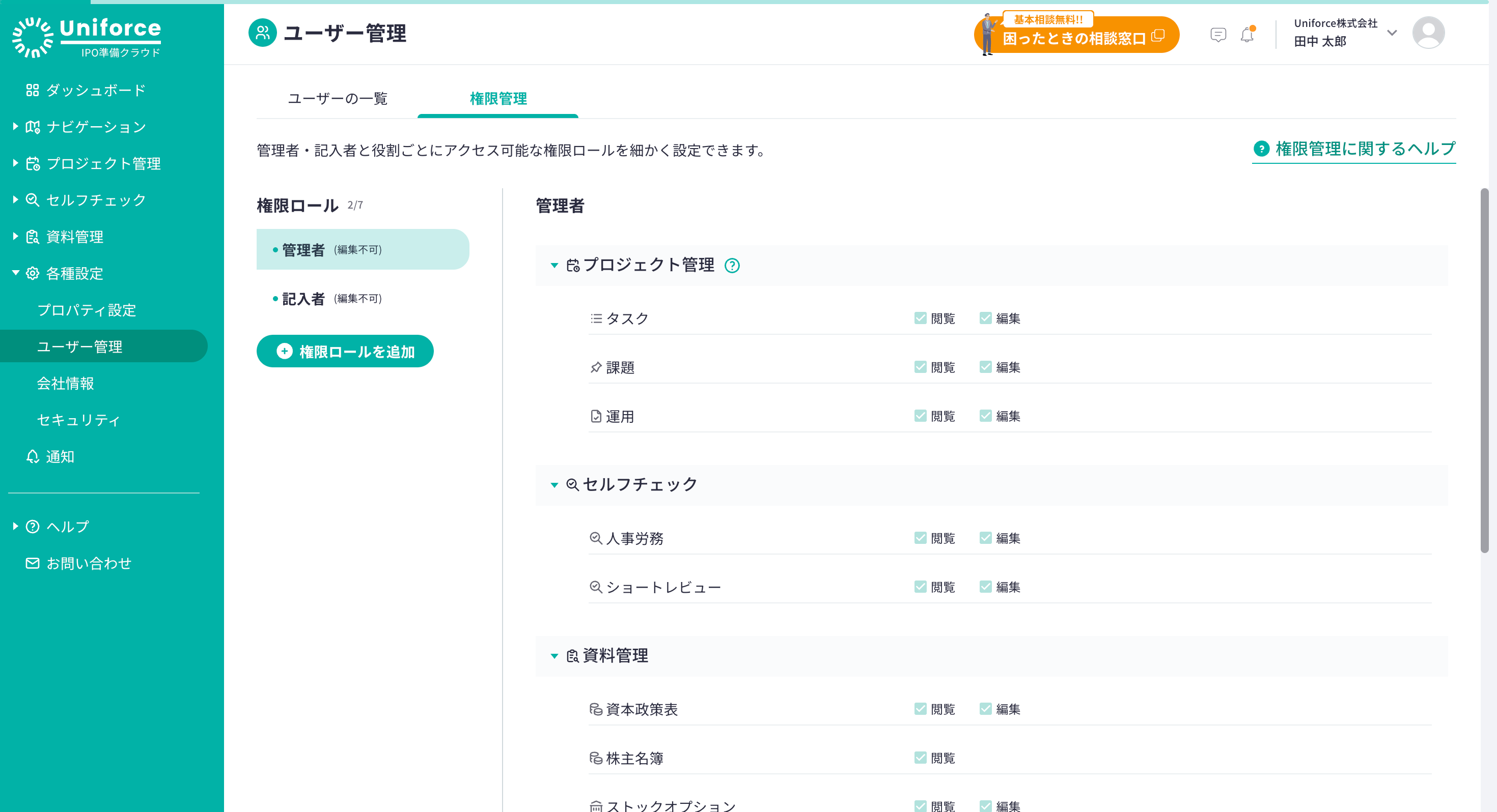 企業フェーズに合わせて持続的な成長の基盤を構築する「ガバナンスグロース」をミッションに掲げるUniforce株式会社(読み:ユニフォース 代表取締役CEO:砂田 和也、以下「Uniforce」)は、IPO準備支援クラウドサービス「IPO準備クラウド」において、機能ごとに詳細な権限設定が可能となる新機能「権限管理機能」を本日リリースしました。これにより、資本政策表やストックオプションなどの機密性の高い情報に対するアクセス制御が柔軟に行えるようになりました。