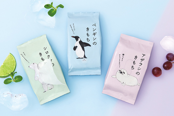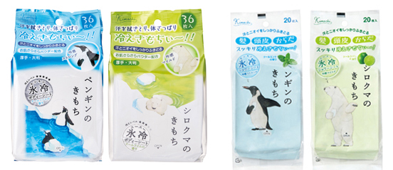 左から 氷冷シャワーシート シロクマ・ペンギン、涼感フェイスシート アザラシ
