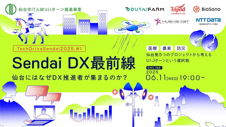 「仙台市IT人材UIJターン推進プロジェクト」では、仙台市でテクノロジーを活用しながらはたらく、暮らす魅力を伝えるDay1~3のイベントを開催します。第1弾となるDay1では、オンラインで「Sendai DX最前線。仙台にはなぜDX推進者が集まるのか?」をテーマに、社会インフラの老朽化や地域産業の担い手不足等特に地方都市で顕在化している課題に対してテクノロジーで立ち向かう仙台発の企業の方が登壇し、パネルディスカッションを通じて現場の声とともに解説していただきます。