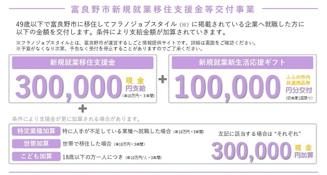 富良野市では、次代を担う人材の確保と移住・定住の促進のため、富良野市に移住し地場企業に就職された方に支援金等を支給しています。