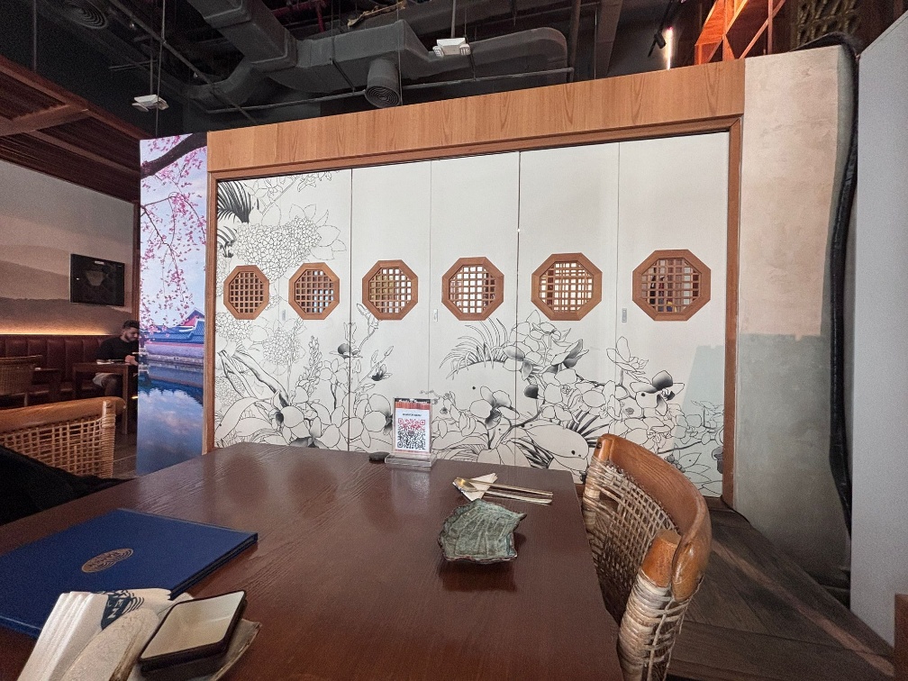 屏風を使う内装は日本らしさ、小鉢や鉄のスプーンは韓国らしさを演出しています。
