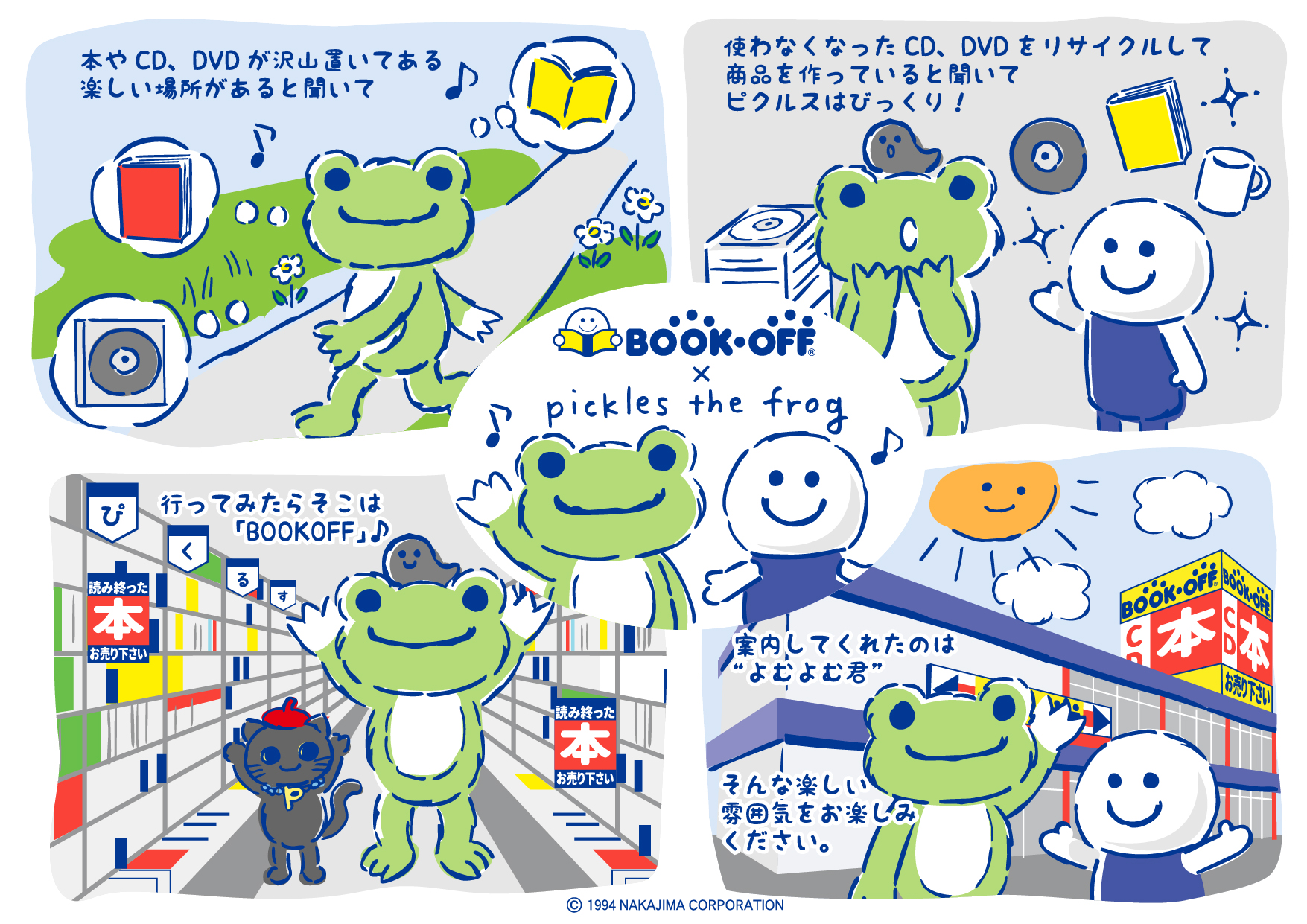 今回のコラボレーション商品はポップアップイベントにて販売するほか、2025年6月26日(木)から8月31日(日)の期間には、BOOKOFF SUPER BAZAAR 409号川崎港町店にて販売いたします。さらに、より多くの方へCDプラの取り組み背景を知っていただくことを目的に、「よむよむ君」と「かえるのピクルス」が出会う様子を表現したストーリーアートも展開いたします。「かえるのピクルス」とのコラボレーションで、廃棄CD・DVDが商品に生まれ変わる=商品にかえる(循環する)ことを伝え、リユース・リサイクルを身近に感じていただき、循環について考えていただく機会を創出してまいります。