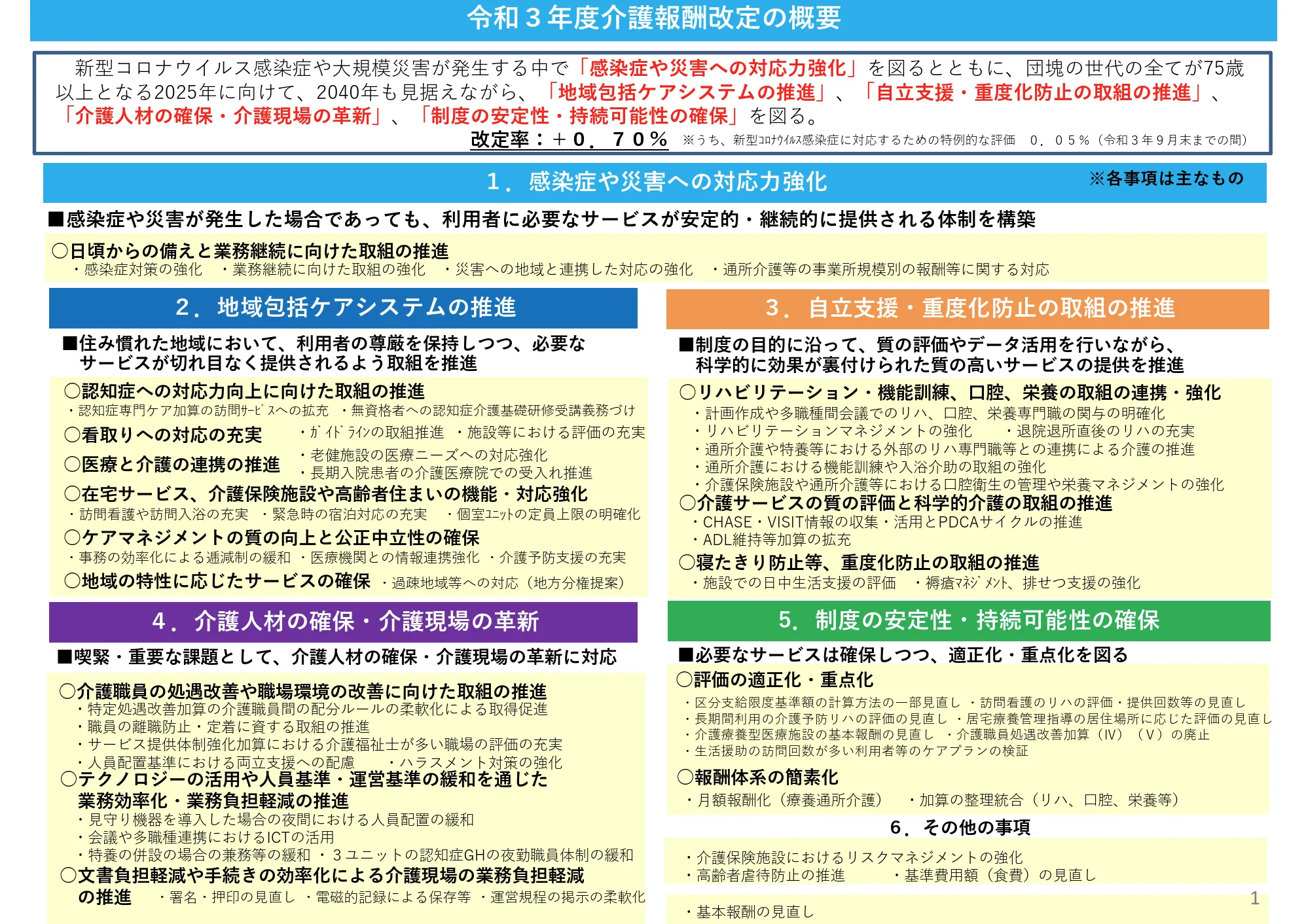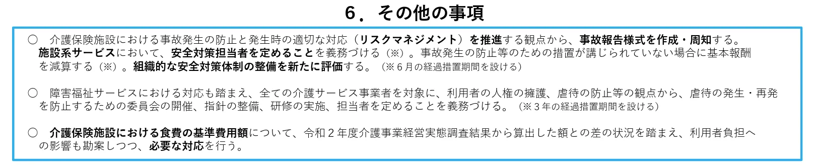 令和3年度の改定では、感染症や災害の発生を踏まえた業務継続計画(BCP)の策定や、人権の尊重や人的事故・リスクに配慮した虐待防止などへの対応が必要となっています。