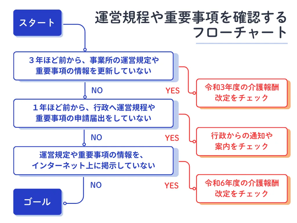 近年の社会情勢や事業環境を踏まえて、必要な運営規程や重要事項等の情報・方法などは追加されていますので、このようなチェックのフローチャートを使ってみるのもおすすめです。