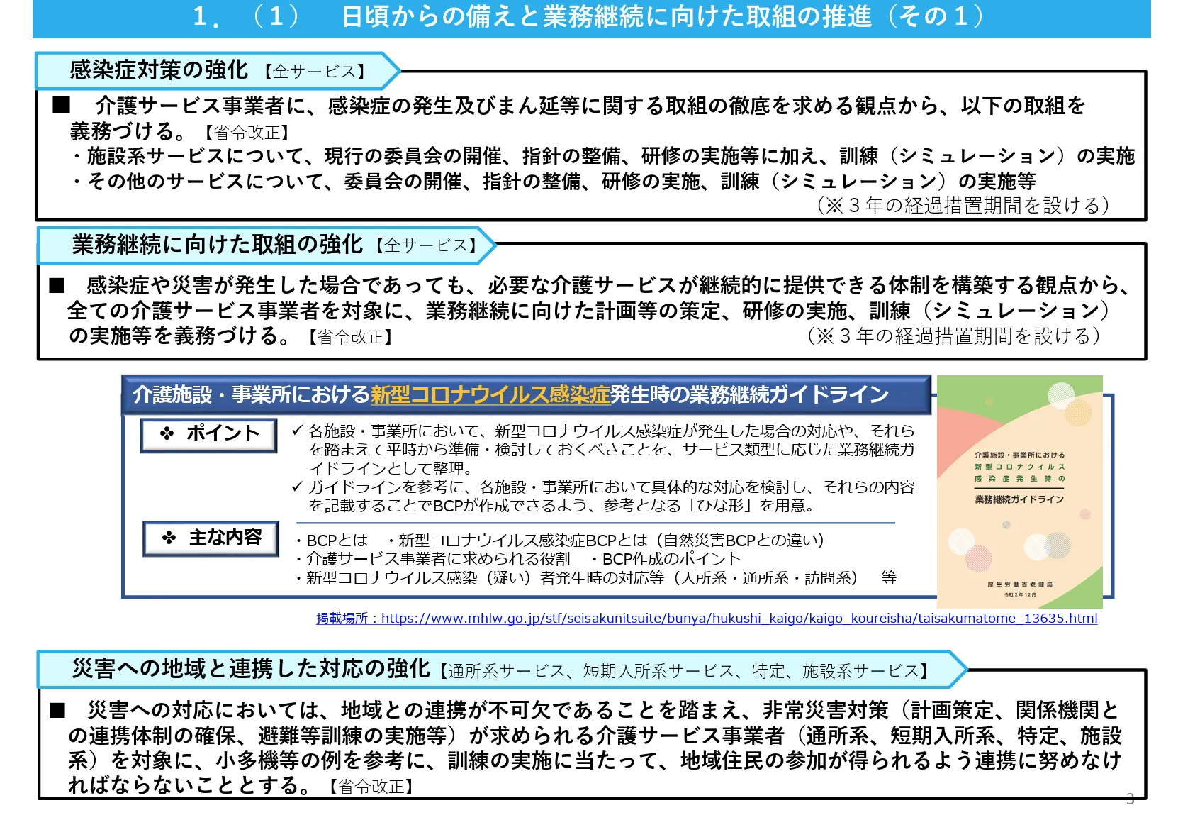 これらの感染症や災害への対応については、3年の経過措置期間を経て、令和6年度までにそれらを踏まえた業務継続計画(BCP)や、具体的な取り組みとなる研修や訓練を実践していくことになります。