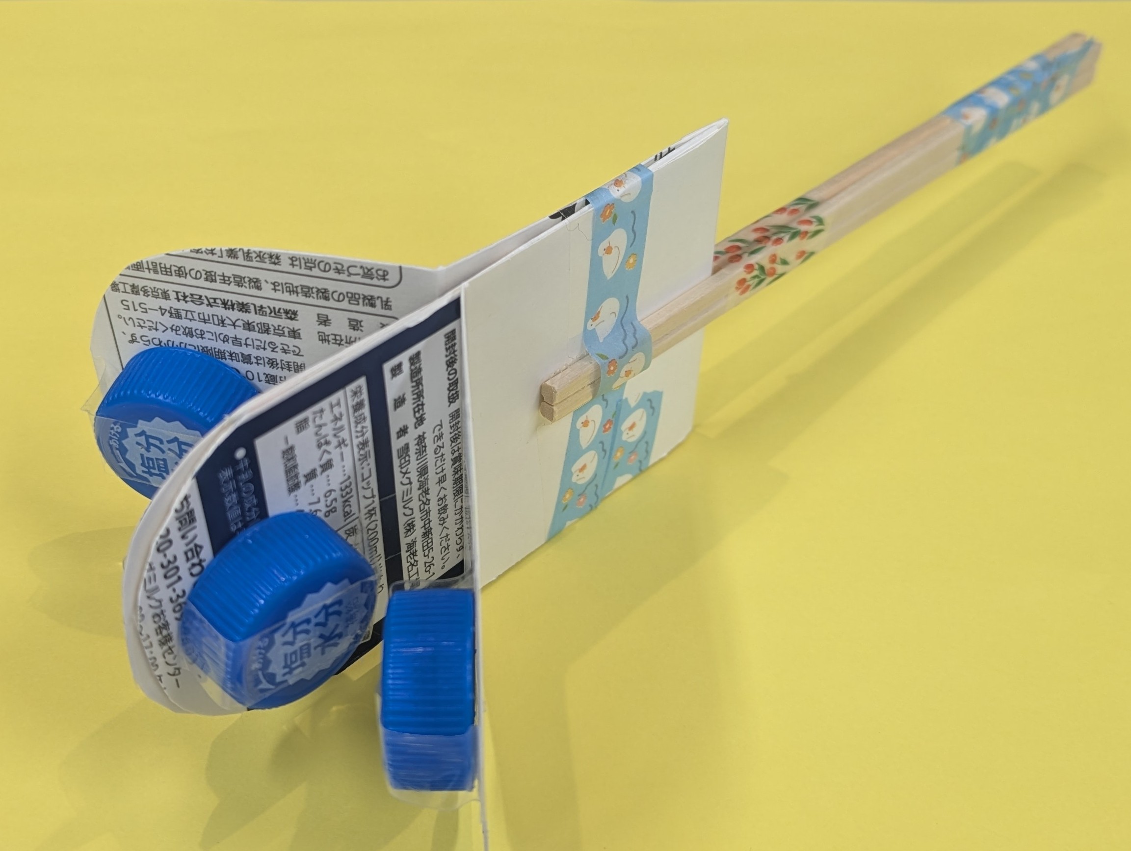 「キャップネット」は、牛乳パック(1000㎖)が1本、ペットボトルのふたが2個…それをはさみで切ったり、ホチキスやセロハンテープでくっつけたり…たったこれだけの材料で楽器が作れます。