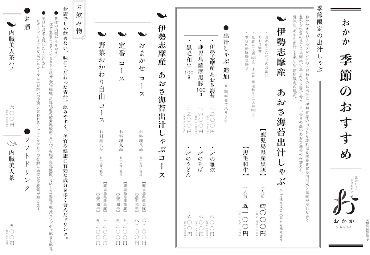 内 容: 一人前 あおさ海苔、黒豚または黒毛和牛、本日の新鮮野菜盛り、おかかこだわりのお出汁