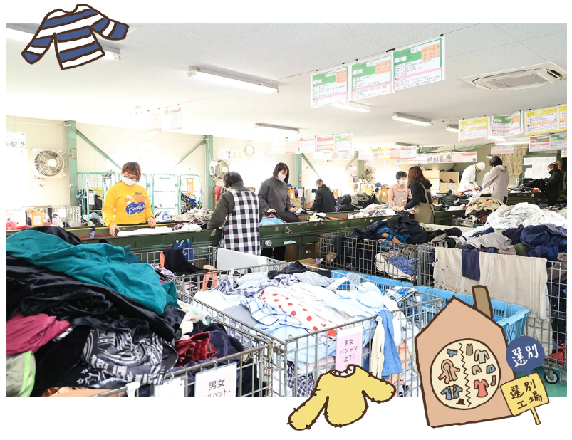 まず、選別という工程を行い100種類以上に服を仕分けます。