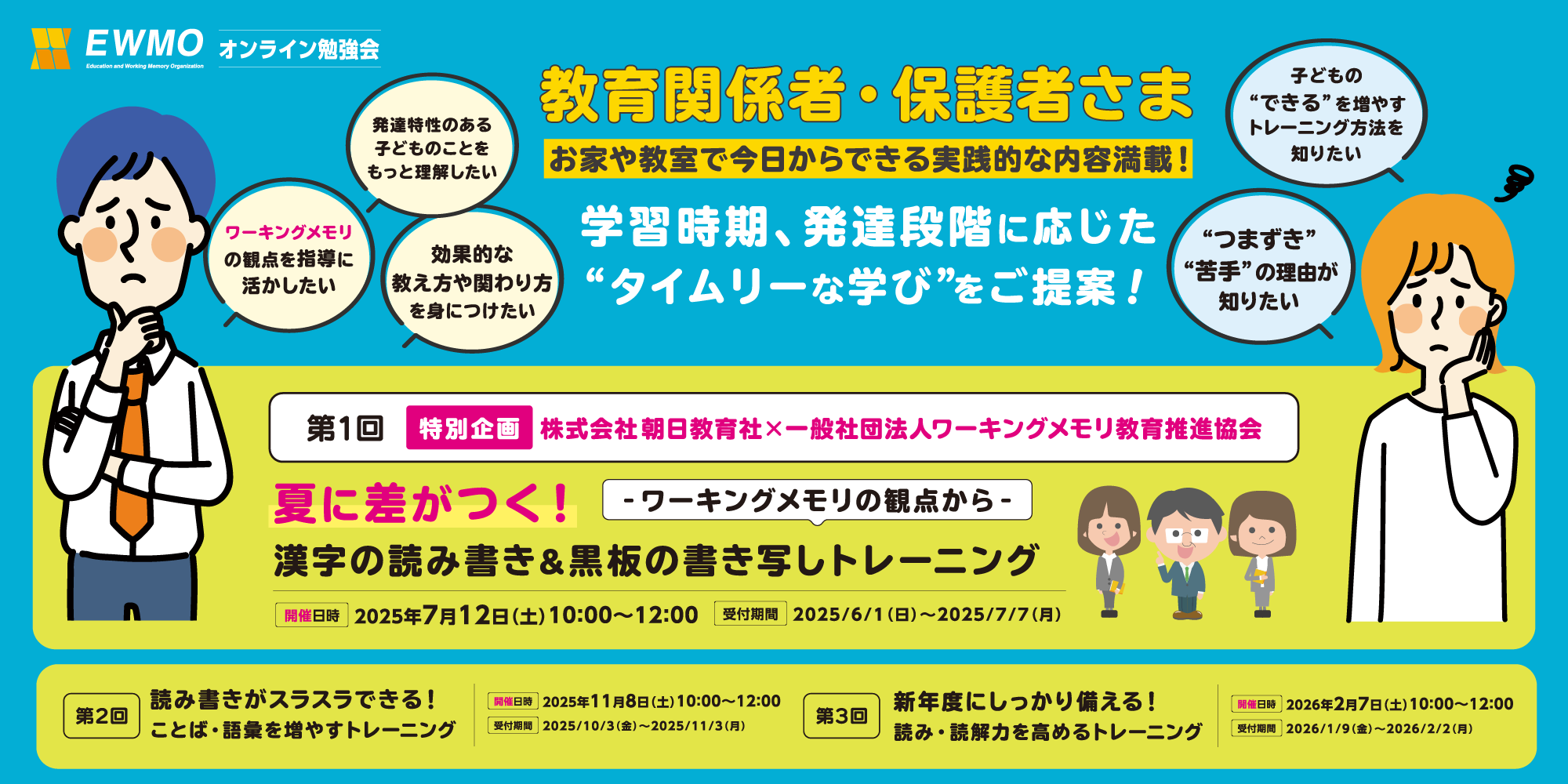 教育関係者・保護者を対象にした「EWMO2025年度オンライン勉強会(全3回)」が開催されます。第1回は7月12日(土)、『夏に差がつく!漢字の読み書き&黒板の書き写しトレーニング』をテーマに実施。広島大学大学院教授の湯澤正通氏が、ワーキングメモリの視点から学習のつまずきや苦手への具体的な対応法をわかりやすく解説します。本イベントは、株式会社Progress CEO・秦有樹がプロデュースするEduSemiシリーズの一環で、株式会社朝日教育社と一般社団法人ワーキングメモリ教育推進協会の共同企画。発達特性に応じた“タイムリーな学び”を、学校や塾、家庭で今すぐ実践できる形でお届けします。