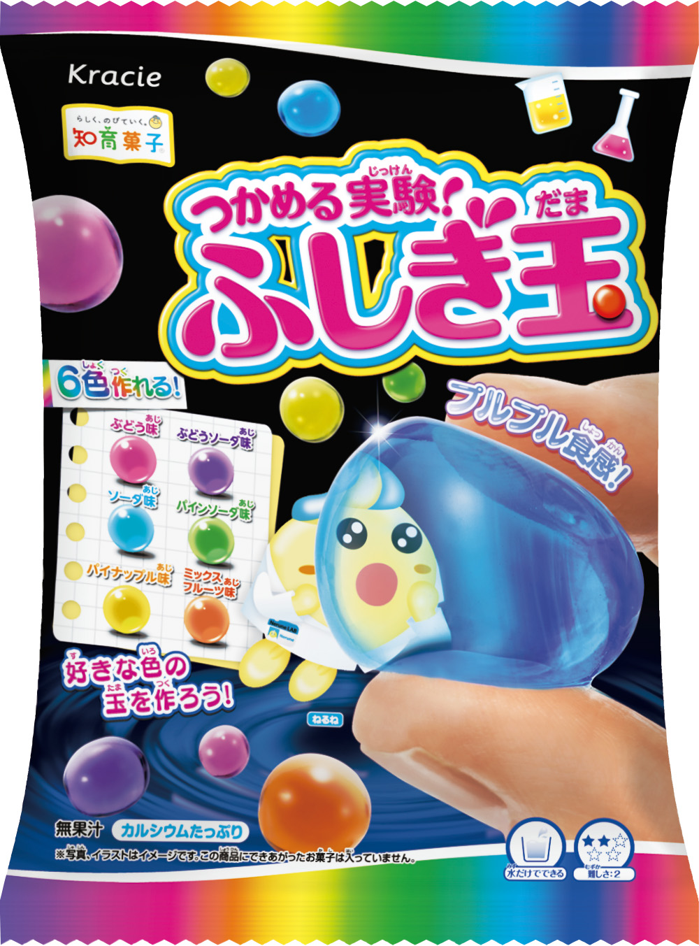 「つかめる実験!ふしぎ玉」は、粉と水を混ぜることで、液体が手でつかめる「ふしぎ玉」を作ることができる実験要素たっぷりの知育菓子®です。プルプルの水の玉をつかむという驚きの体験と、見た目の楽しさ・味わいが重なり合い、2018年の発売以来、多くのお子さまや保護者の方々に親しまれてきました。
