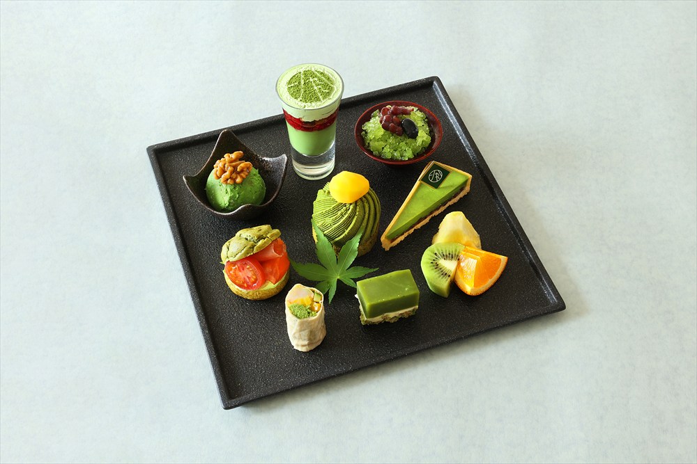 同プレートは、夏を連想させる鮮やかな緑の9品を一皿に盛り付けます。スイーツとセイボリーには、抹茶を使用しています。