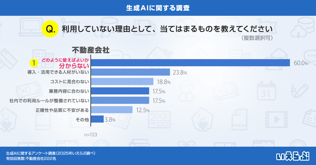 一方、生成AIをまだ利用していない不動産会社(※3)にその理由を尋ねたところ、「どのように使えばよいか分からない」が60.0%と圧倒的に多く、次いで「導入・活用できる人材がいない」(23.8%)という回答が続きました。
