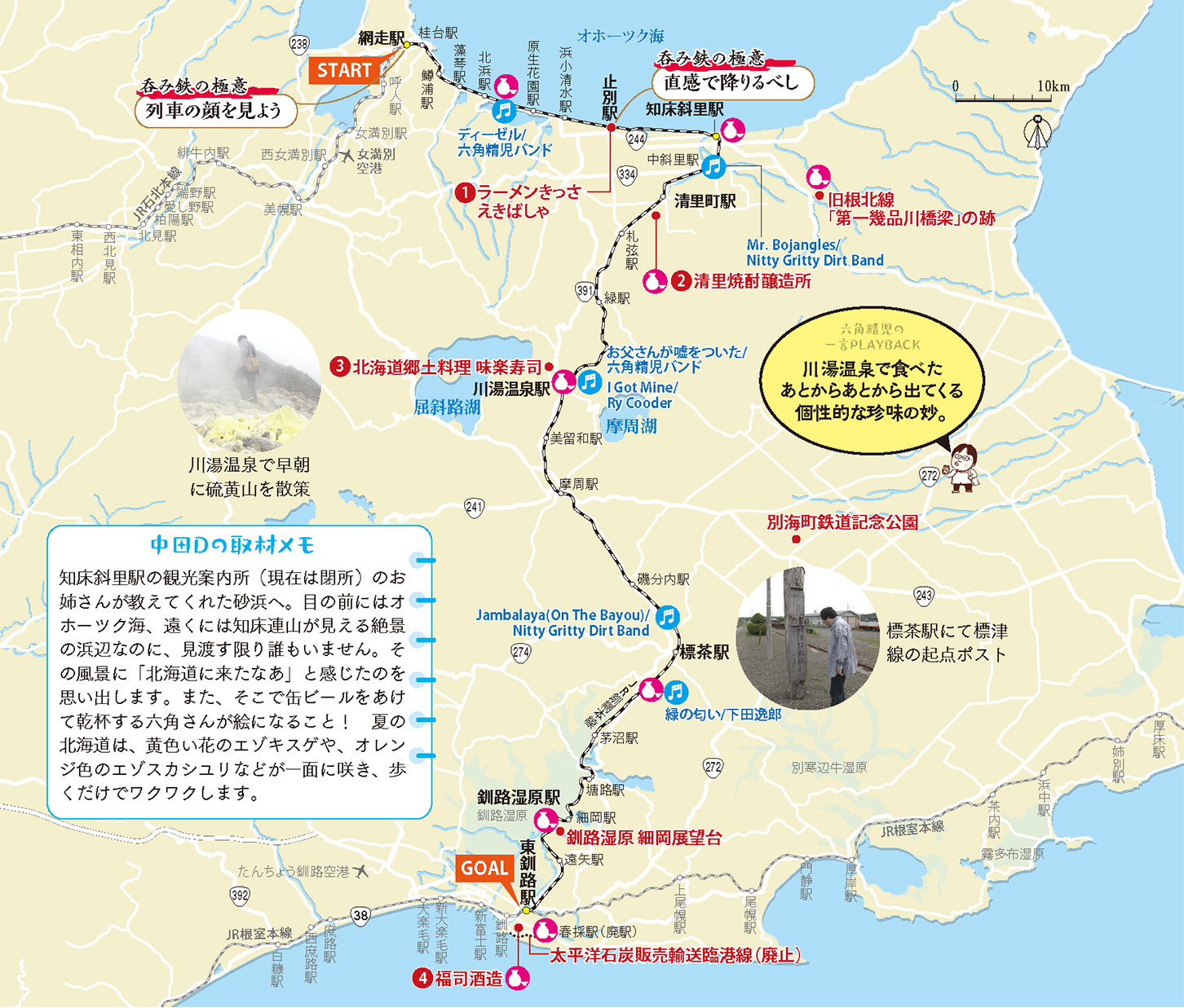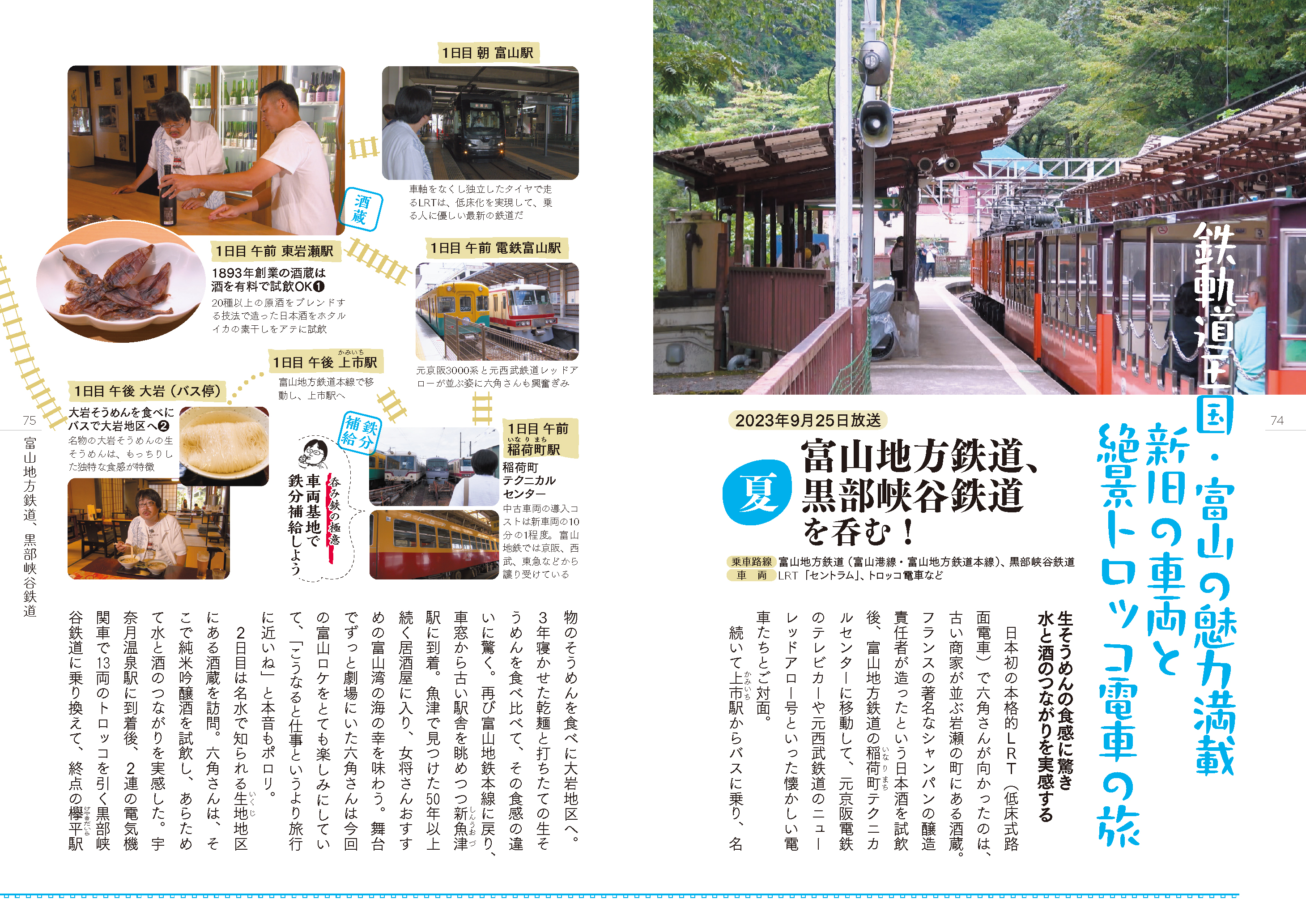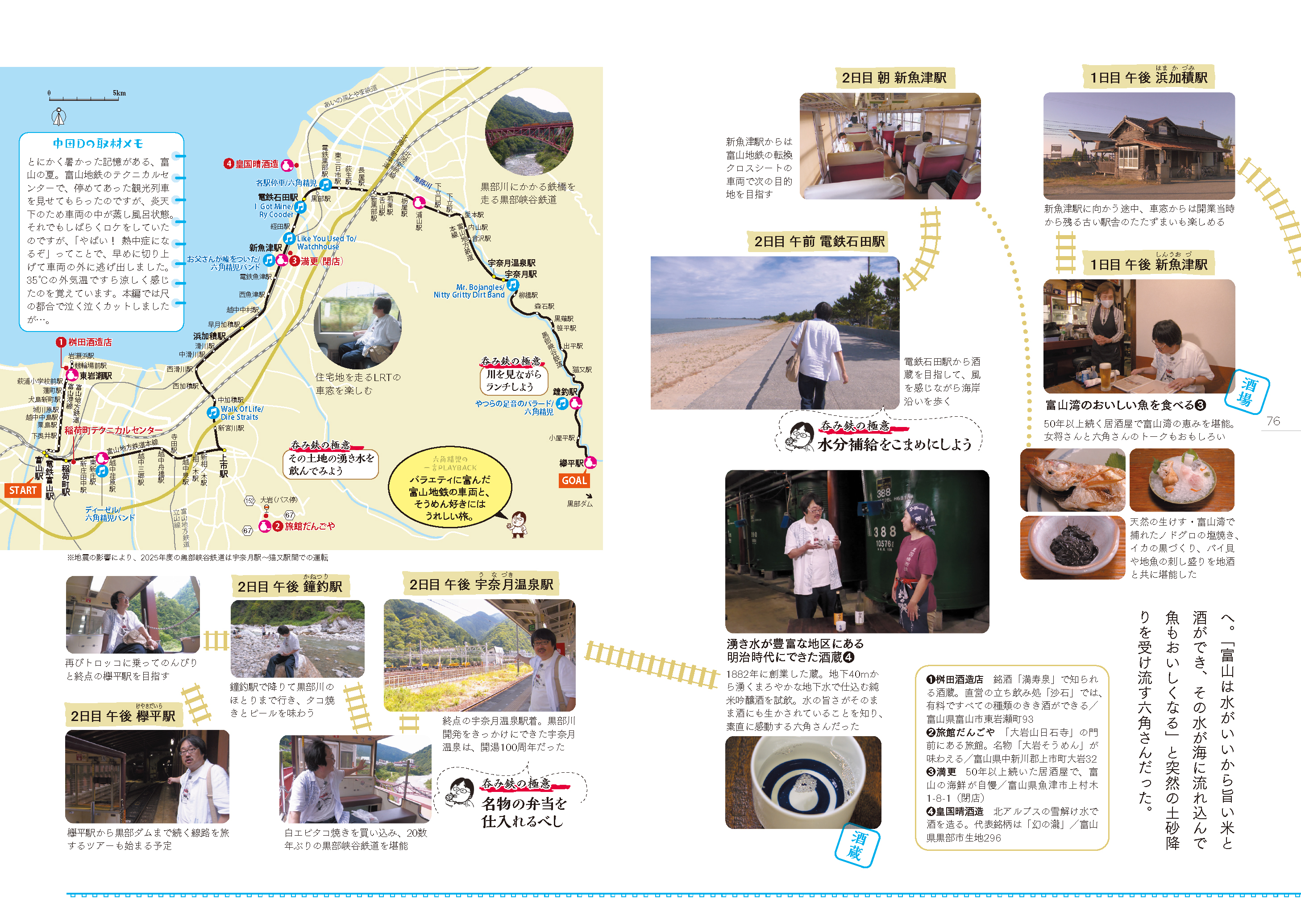 旅の行程を時系列に沿ってプレイバック。店や酒蔵の情報も掲載しているので、旅行ガイドとしても使えます。詳細なコースマップには番組でかかったBGMも記載し、呑み鉄旅に没入必至。ディレクター・中田一宏さんの裏話も必見です。