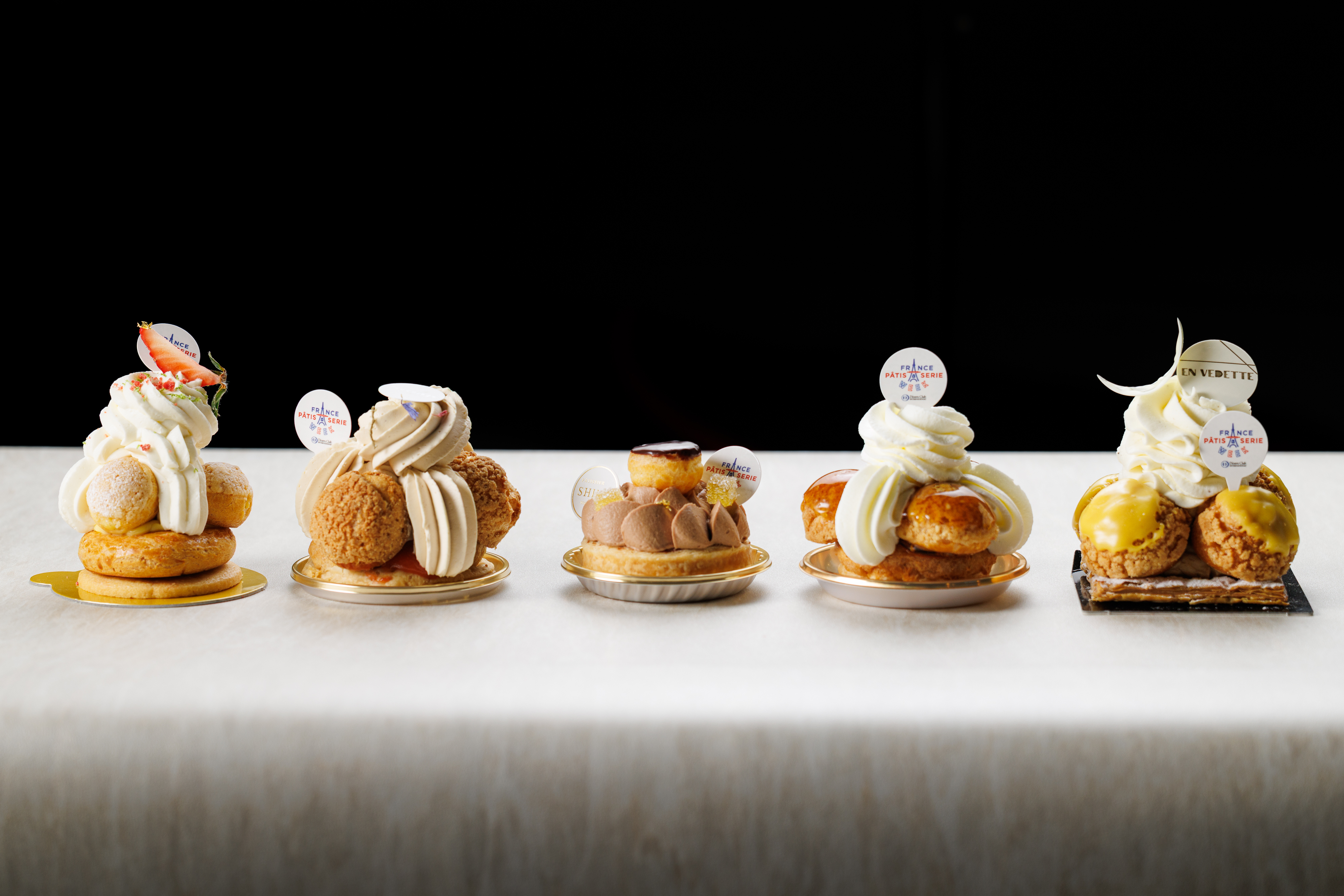 今年のテーマスイーツは「サントノレ」(Saint-honoré)。19 世紀にパリのサントノーレ通りにあるパティスリー「シブースト」で誕生したとされるフランスの伝統菓子。円形のパイ生地の上にクリームを絞り、キャラメルでコーティングしたミニシューを飾り付けます。その見た目は公爵の王冠をイメージしており、フランスでは特別な日にいただくお菓子として親しまれています。