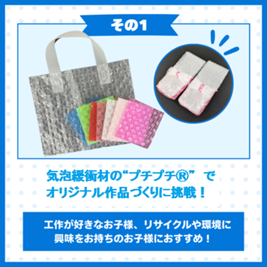 川上産業株式会社とコラボし、気泡緩衝材“プチプチ®”を使ってバッグやスリッパを制作。クイズを通してリサイクルについても学びます。