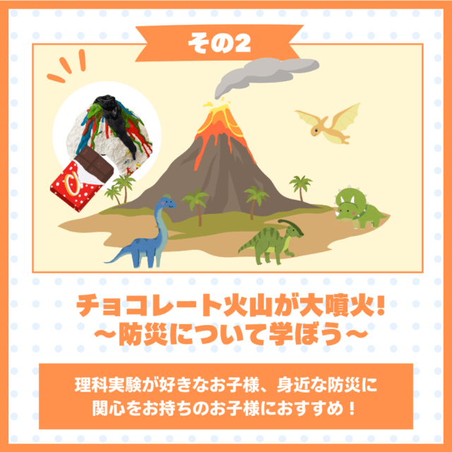 チョコレートを使った噴火実験で地層を学び、クイズや工作を通じて防災について探究。自由研究にもおすすめです。