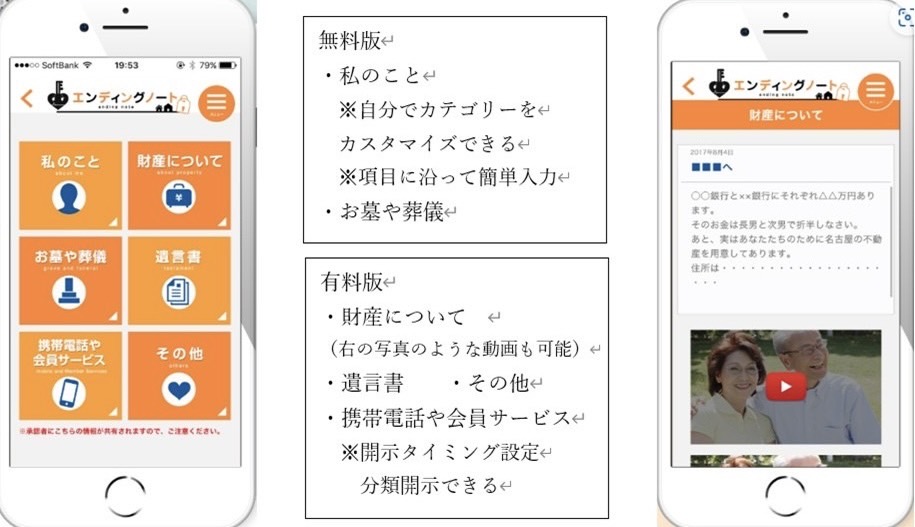 アプリ利用には無料版と有料版(月額998円)があり、有料版では全国初の機能を搭載―伝えたいことを伝えたい人だけにアプリ内で分類開示できる仕組みや、まだ秘密にしておきたい重要な財産分与などの情報を、遺言書と同じように、死亡届などの公的証明書をアプリ内に登録し、家族らが2人以上認証することで情報閲覧できる仕組みも利用可能になります。