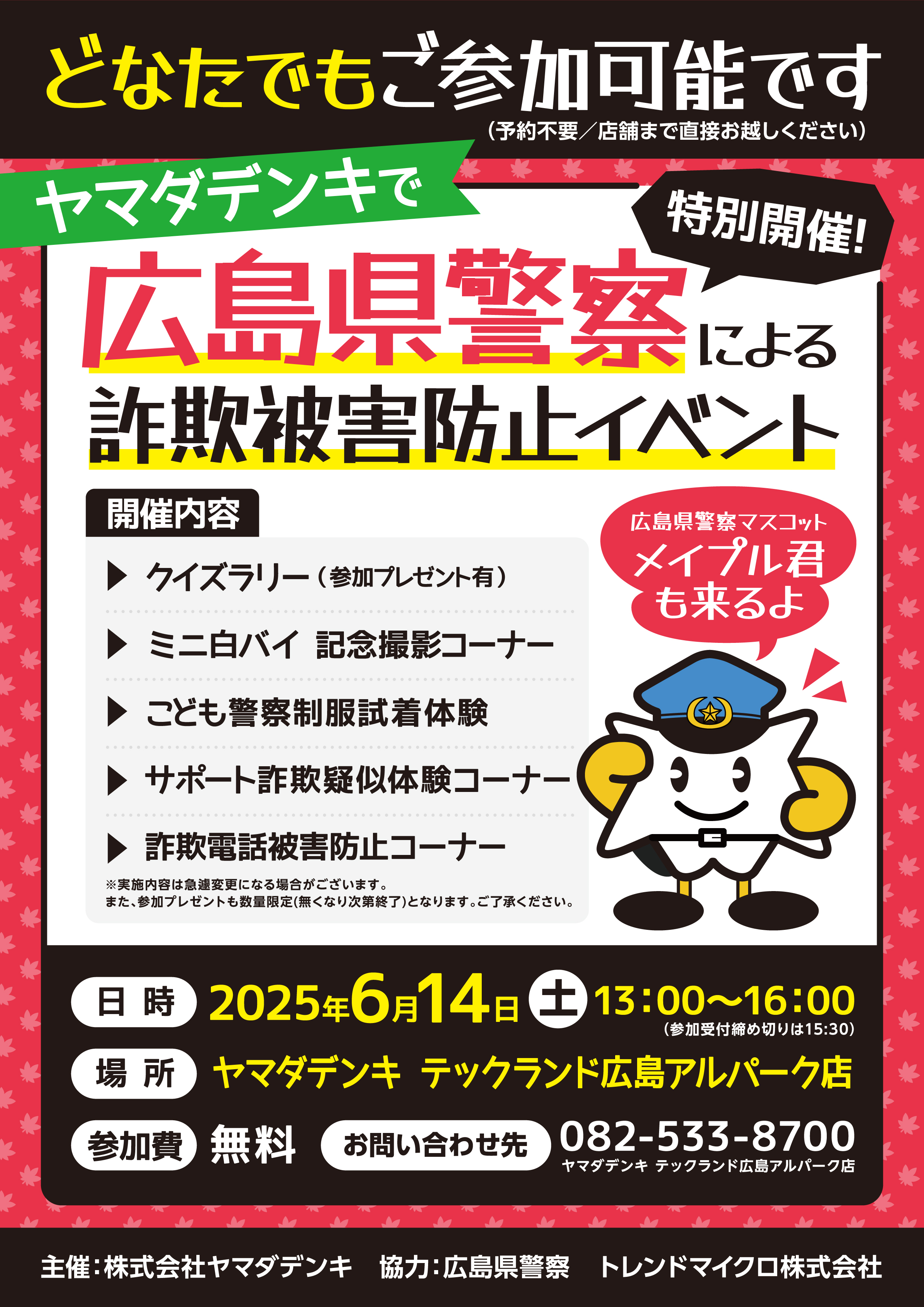 株式会社ヤマダホールディングス(本社:群馬県高崎市、代表取締役会長 兼 CEO:山田 昇、以下、ヤマダホールディングス)は、広島県警察の詐欺被害の防止に向けた取り組みに賛同し、2025年6月14日(土)にグループ企業である株式会社ヤマダデンキ「Tecc.Land 広島アルパーク店」において、「詐欺被害防止イベント」を開催いたします。