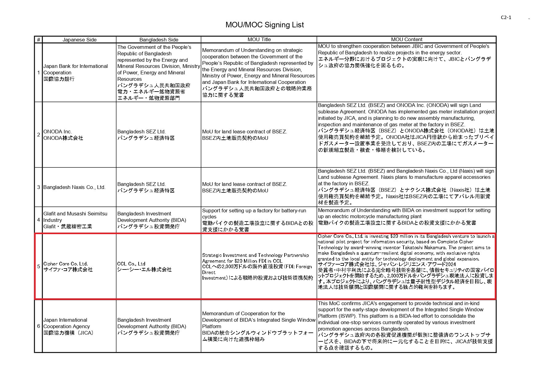 サイファ・コア株式会社(本社:東京都、代表取締役社長:中村宇利)は、バングラデシュ現地のベンチャー企業「CC Ltd.」に対し、2,000万ドルの投資に関する覚書(MOU)を締結いたしました。本覚書は、日本とバングラデシュの経済・投資協力の一環として署名された6件のMOUのうち、当社の取り組みが第5番目として発表され、バングラデシュ暫定政権のムハンマド・ユヌス首席顧問の立ち会いのもとで行われたことをご報告いたします。