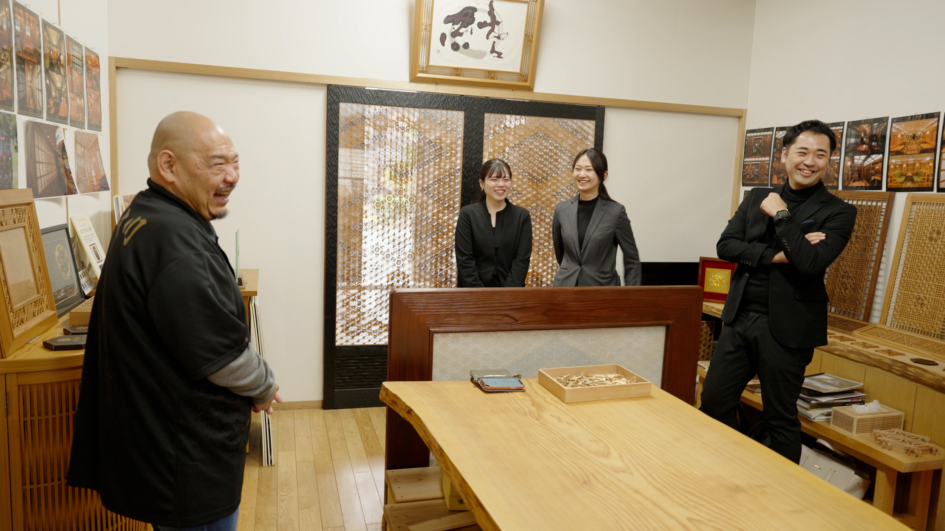 「作品を納めたときのお客様の笑顔が一番の喜び」。そう話す木下氏の組子にかける熱い想いに触れ、工房を訪れた八芳園スタッフが「この想いを多くの人に伝えることが私たちの使命」と涙する姿も。