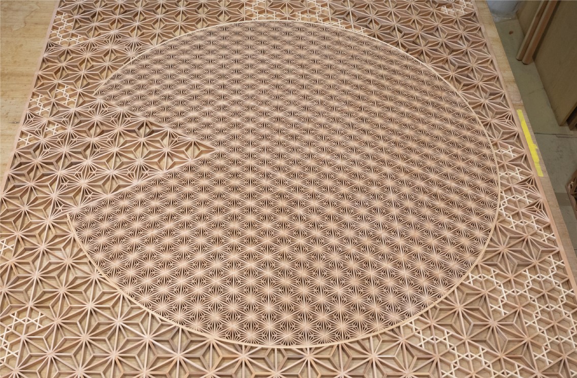 ◾️伝統的な文様を連ねて表現する直径1メートルの「太陽」など、細やかな表現で八芳園が誇る庭園の姿を組子で映し出す