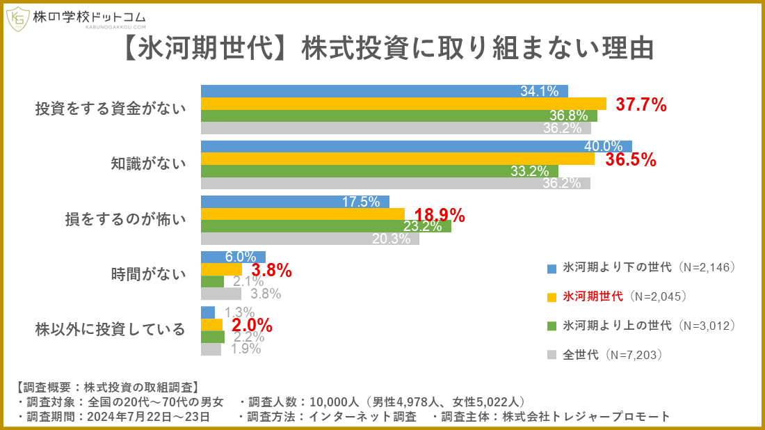 1万人調査で「株式投資に取り組んでいない」と回答した人にその理由を聞いたところ、最も多かった回答は「投資する資金がない」の37.7%でした。これは全世代でも36.2%で、上の世代・下の世代ともに同じくらいの結果になっていることから、氷河期世代だけ突出して「資金がない」というわけではないように見えます。