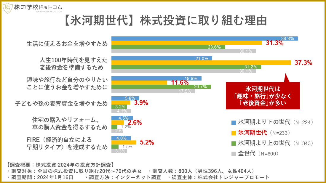 これに対して氷河期世代では、「人生100年時代を見すえた老後資金を準備するため」が37.3%と最も多くの回答を集め、「生活に使えるお金を増やすため」の31.3%がそれに続きます。