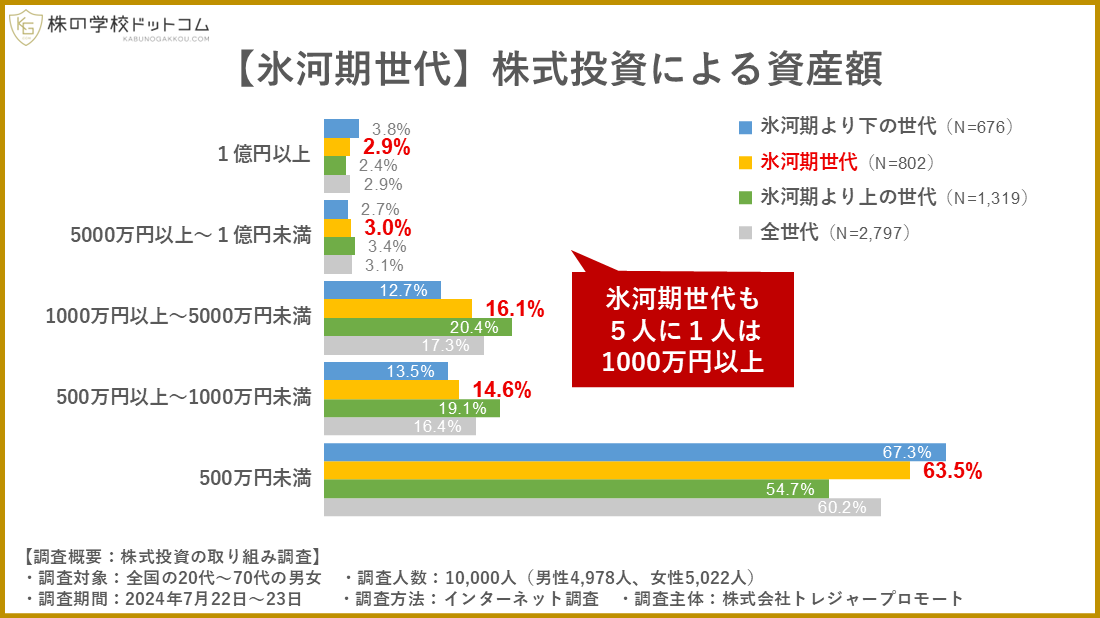 そんな氷河期世代は、株式投資でどれくらいの資産を保有しているのでしょうか。同じ1万人を対象としたアンケート調査(2024年7月実施)では、株式投資に取り組んでいると回答した氷河期世代(802人)のうち、63.5%にあたる509人が「500万円未満」と回答しました。これは、他の世代と比べて見ても大きな違いはありません。