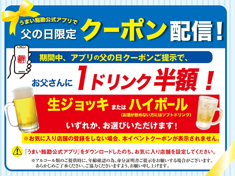 ※お父さんご本人のみご利用いただけます。1クーポンで1杯限りのご利用です。