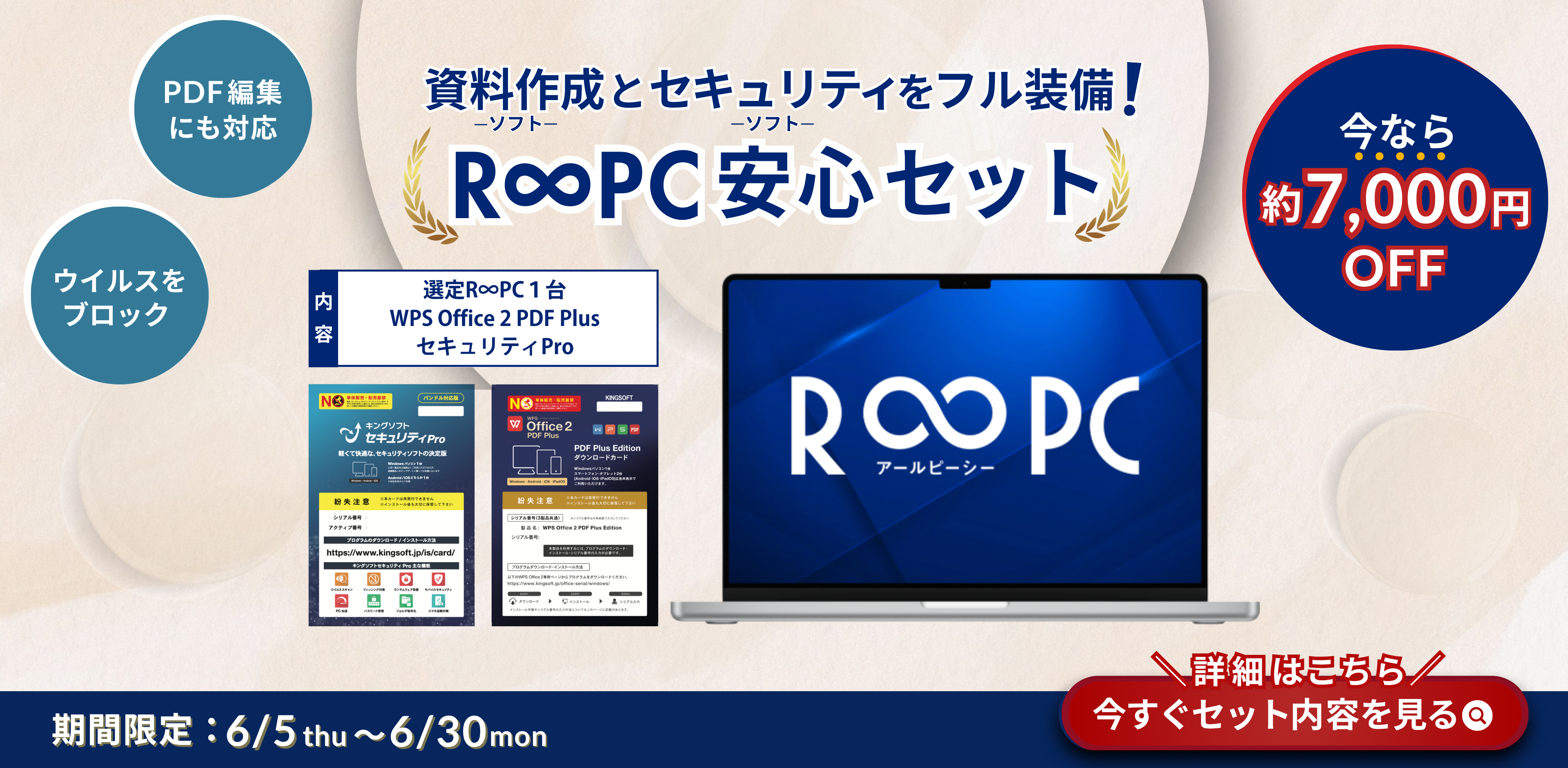 リユースPC事業を展開するリングロー株式会社(本社:東京都豊島区、代表取締役:碇敏之、以下「リングロー」)は、公式オンラインストア「R∞PCダイレクト(アールピーシーダイレクト)」にて、リユースパソコン「R∞PC(アールピーシー)」および「R∞PC LIGHT(アールピーシーライト)」の購入者向けに、仕事にもプライベートにもすぐに使える実用ソフトを2本セットで搭載したキャンペーンを、2025年6月5日(木)より開催します。 「中古パソコンはソフトが入っていないから不安」「買ってから使えるまでに時間がかかる」——そんな声にお応えして、資料作成からセキュリティ対策までを“最初からフル装備”した安心セットをご提供します。
