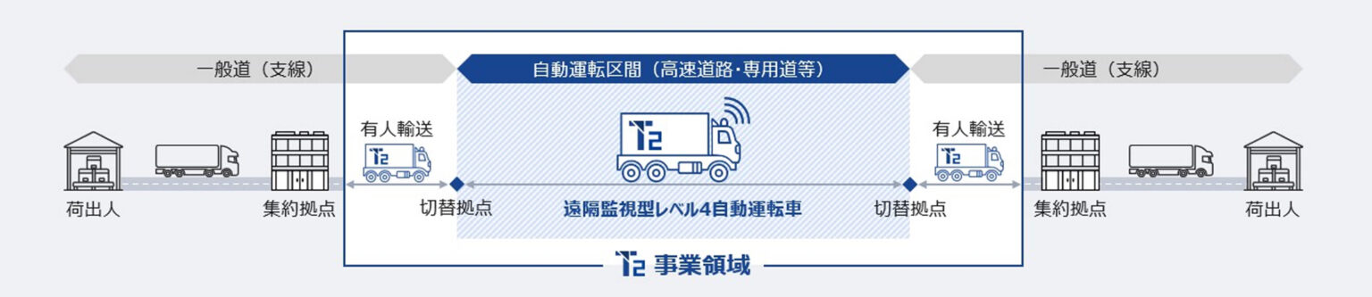 T2の事業概要:高速道路などの自動運転区間は無人運転で、集約拠点・切替拠点間は有人運転での輸送を想定
