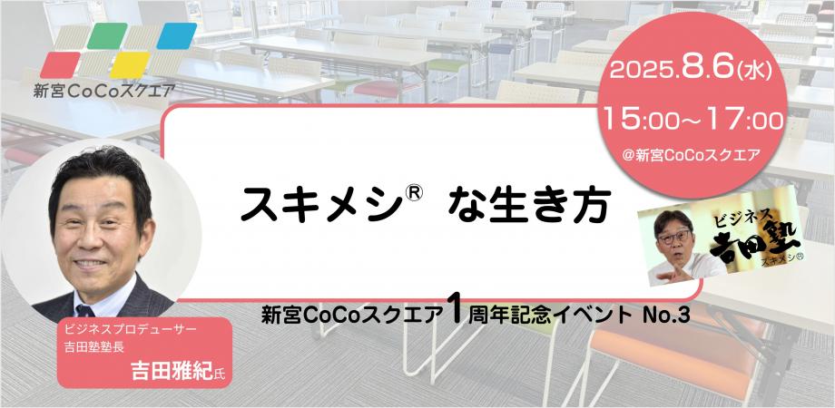 地域とともに多様な働き方を応援する「新宮CoCoスクエア」(所在地:福岡県糟屋郡新宮町)は、1周年記念イベントの一環として、2025年8月6日(水)に「スキメシ®な生き方」と題した特別講演会を開催いたします。講師には、起業支援の第一人者であり「スキメシ®」の提唱者である吉田雅紀氏をお迎えします。