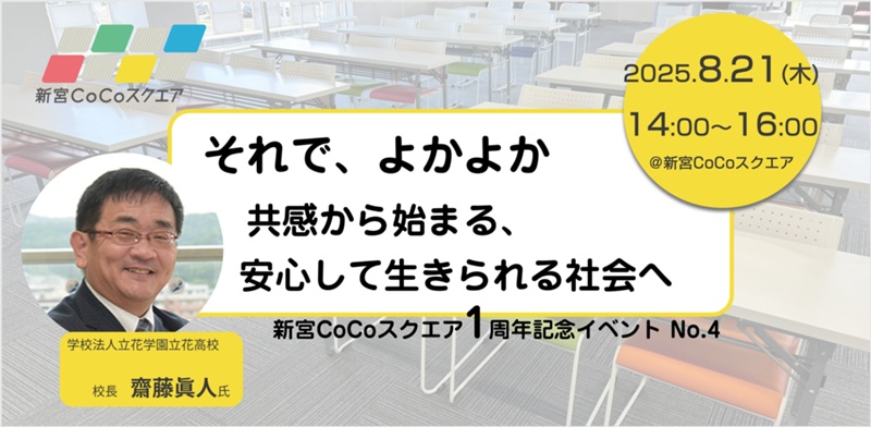 多様な働き方と生き方を応援する「新宮CoCoスクエア」では、地域や社会に問いかける1周年記念イベントの一環として、立花高校校長・齋藤眞人氏(通称:校長ちゃん)による講演会を開催いたします。 タイトルは「それで、よかよか」。その一言に込められた“共感”と“肯定”の力を、教育現場での実践を通じて語っていただきます。 子どもたちの未来を支えるために、私たち大人は何ができるのか。教育、地域、そして私たち自身の生き方を見つめ直す時間を、ぜひご一緒に。