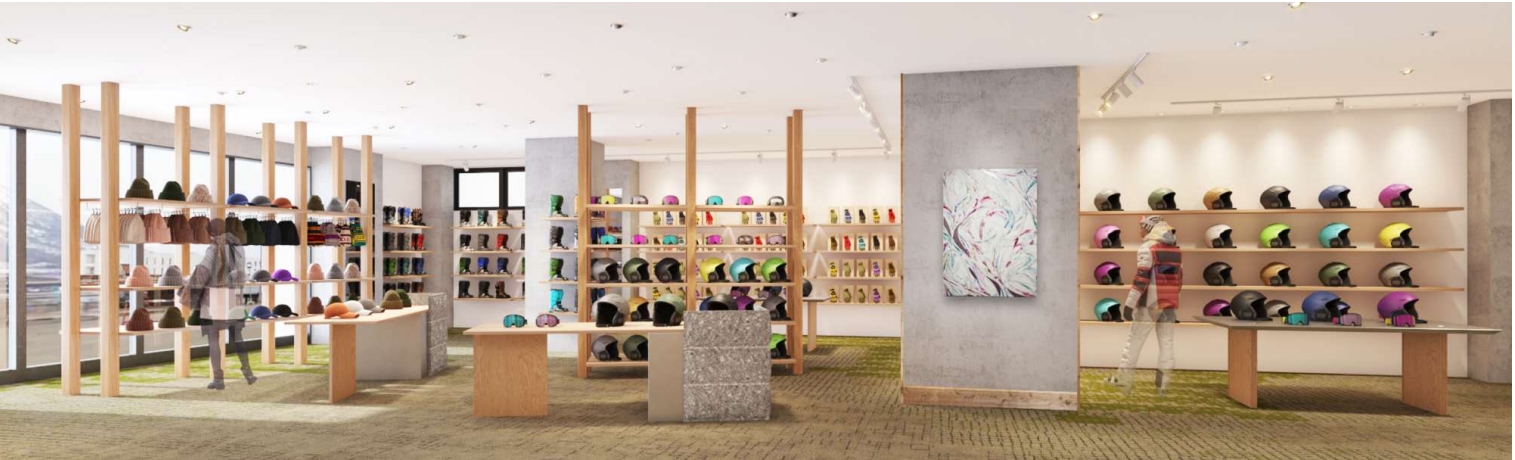 マウンテンセンター内ショップは、これまでのモノトーンを基調とした内装でスキー・スノーボードギアを