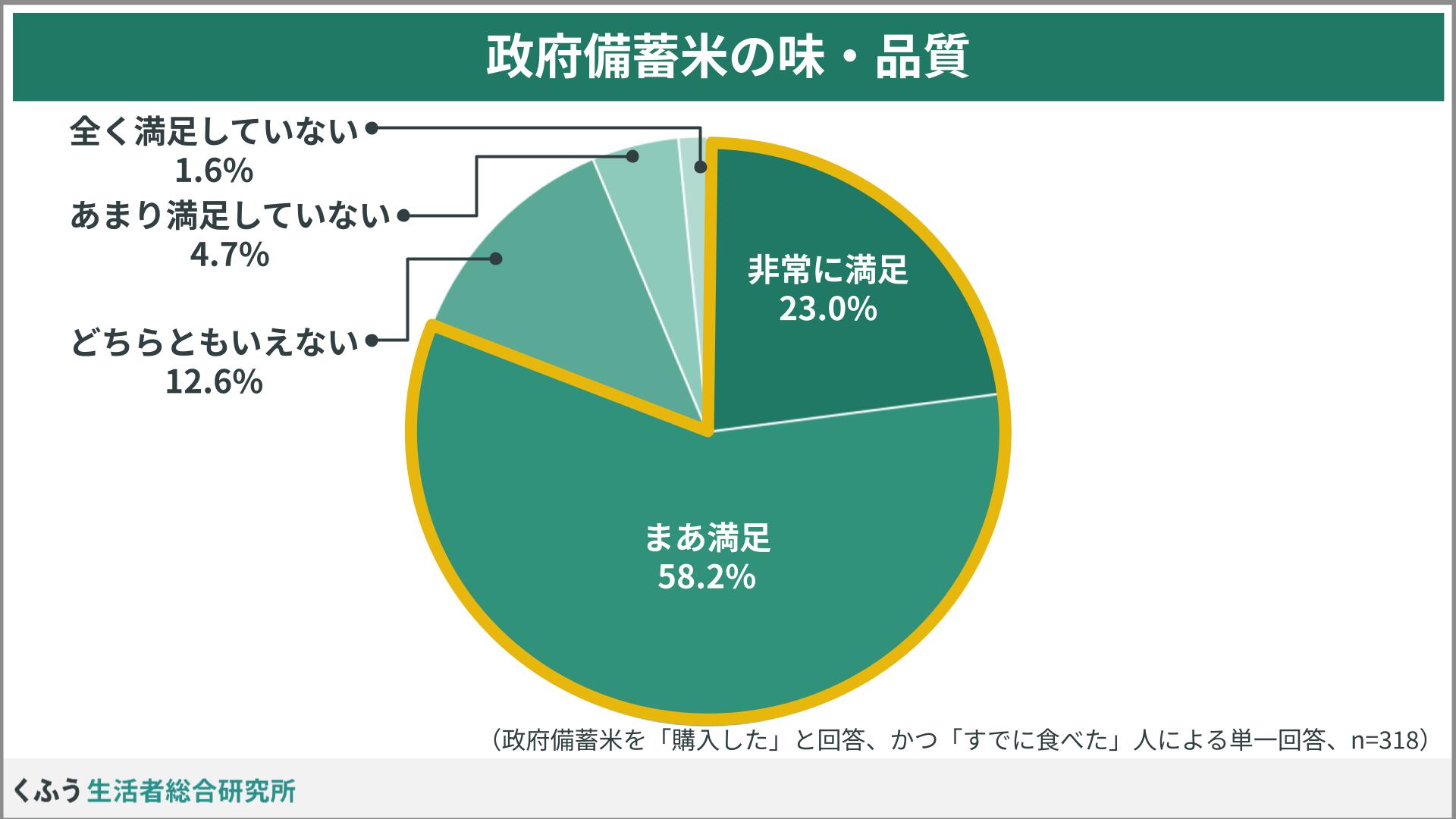 購入した政府備蓄米は「まだ食べていない」と回答した人が42.0%を占めました。すでに食べた人を対象に味や品質についてたずねたところ、「非常に満足」(23.0%)、「まあ満足」(58.2%)を合わせた約8割が満足していることがわかりました。
