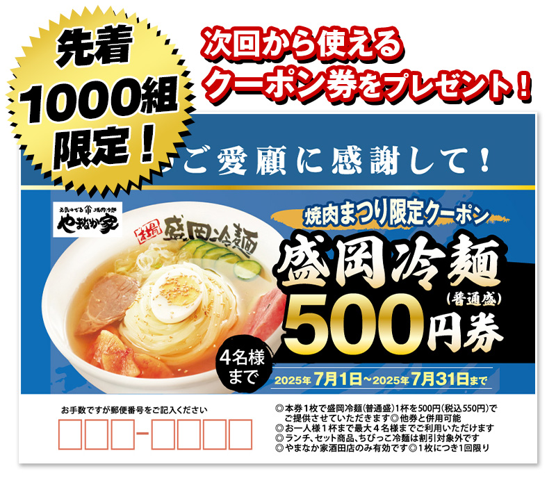 ◆来店特典:先着1000名様に次回使える【盛岡冷麺500円】クーポン券プレゼント※本券1枚で4名様まで利用可能)