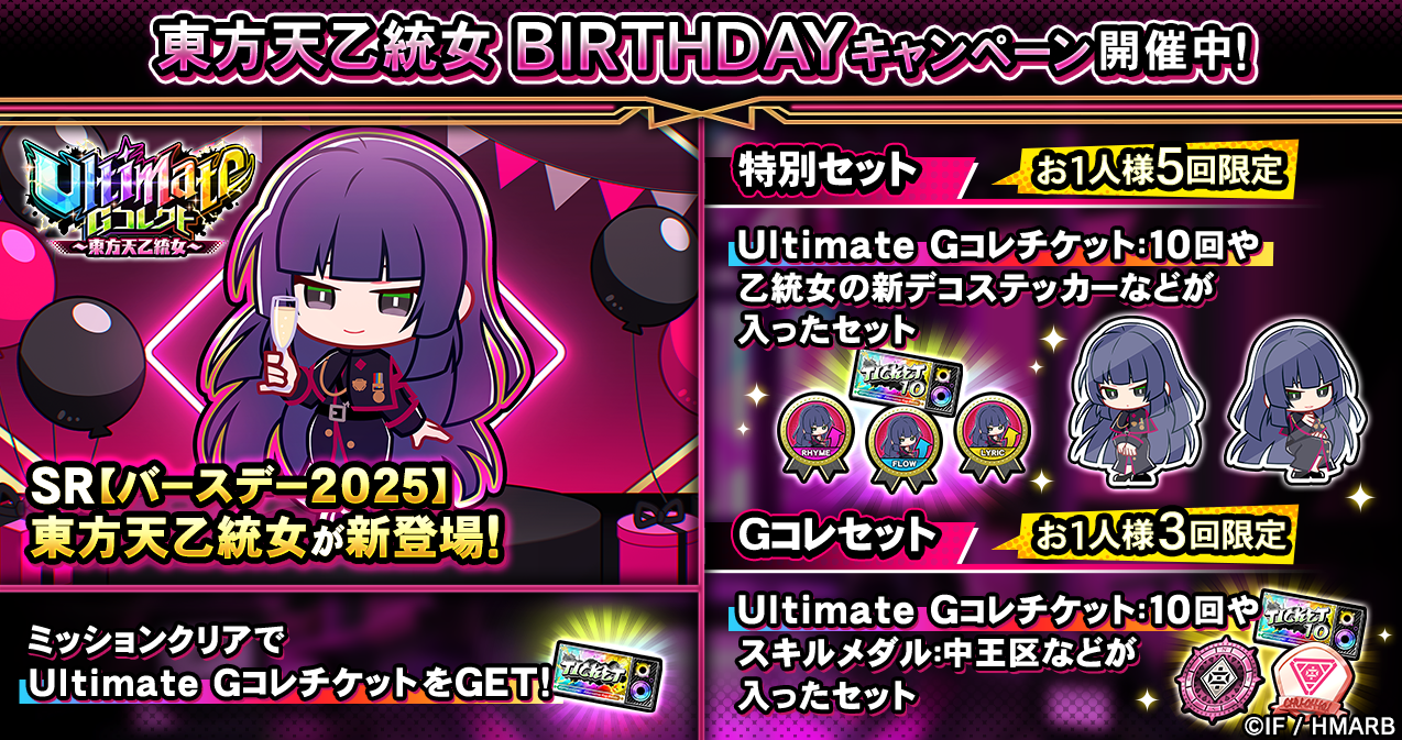 乙統女の誕生日を記念し、「SR【バースデー2025】東方天乙統女」を獲得することができるGコレクトや、乙統女の新デコステッカーが獲得できるアイテムセットを販売しているほか、ビンゴミッションを開催しています。
