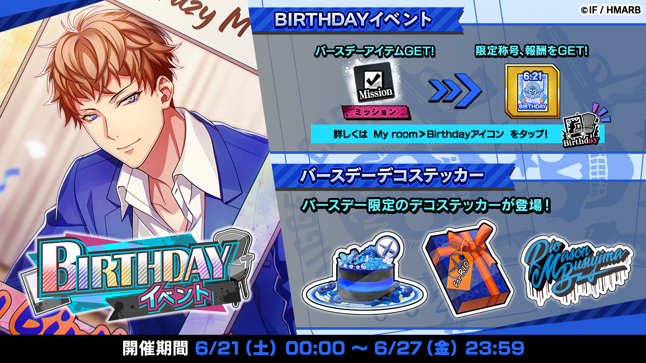 理鶯の誕生日を記念し、「SSR【バースデー2025】毒島メイソン理鶯」を獲得することができるGコレクトや、バースデー限定のデコステッカーが獲得できるイベントなどを開催しています。